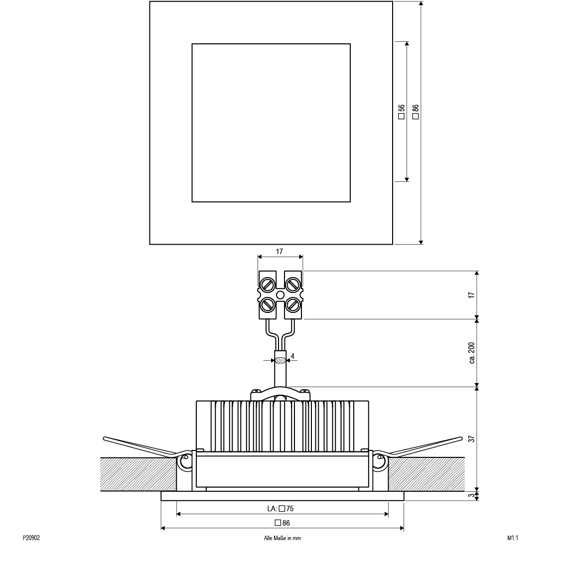 | Bezeichnung | LED Deckeneinbau - quad. - Alu IP20 - 350mA - 10,8W - 3000K - 873lm |