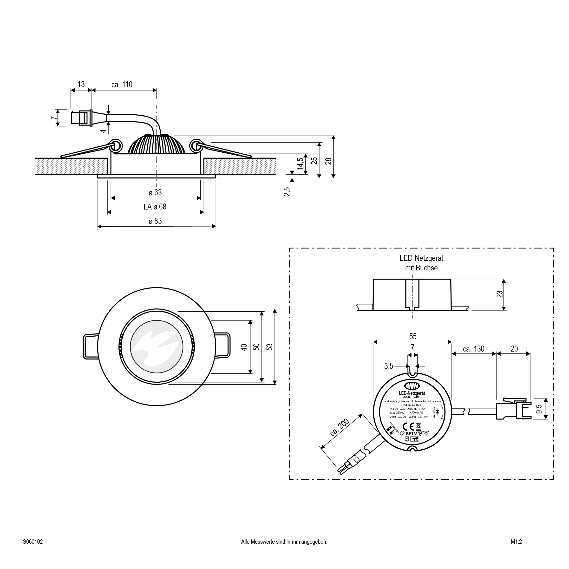 | Artikeltext | Mit der COB-LED Deckeneinbauleuchte lassen sich vielfältige Anwendungen im Innenbereich, wie z. B. Effektbeleuchtung, Raumbeleuchtung, Akzentuierte Beleuchtung und vieles mehr realisieren. Da außerdem die MM-Kennzeichnung gegeben ist, lässt sich diese sogar im Möbelbau verwenden. Die Leuchte kann auch über eine Zentralbatterie betrieben werden, mit einer Eingangsspannung von 179-240V/DC. Aufgrund der rückseitig angebrachten Dichtung erreicht die Leuchte beim Einbau in geschlossene Decken die Schutzart IP54. Zusätzliche Kosten für Leuchtmittel entfallen bei dieser Leuchte, da die Leistung von einem fest verbauten LED-Chip geliefert wird. Da im Lieferumfang das Netzgerät bereits enthalten ist, fallen auch hierfür keine zusätzlichen Kosten an. Das Netzgerät und die Leuchte sind durch Stecker und Buchse miteinander verbunden. Des Weiteren ist das System zusätzlich auch über Phasenabschnitt dimmbar. Der Schwenkwinkel beträgt 25°. Maße Netzgerät (Durchmesser x H): 54 x 23mm. Gehäusefarbe ähnlich RAL9003. |