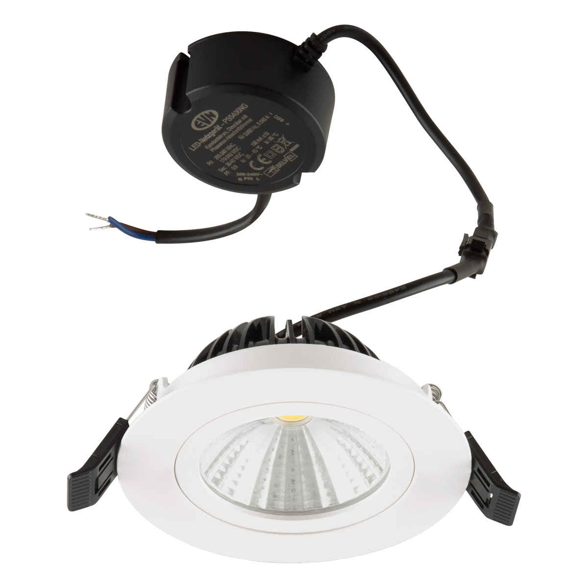 | Bezeichnung | LED Deckeneinbau - rund - schwenkbar - weiß - IP54 - CRI90 200-240V - 5,5W - 3000K - 662lm - inkl. dimmbaren NG |