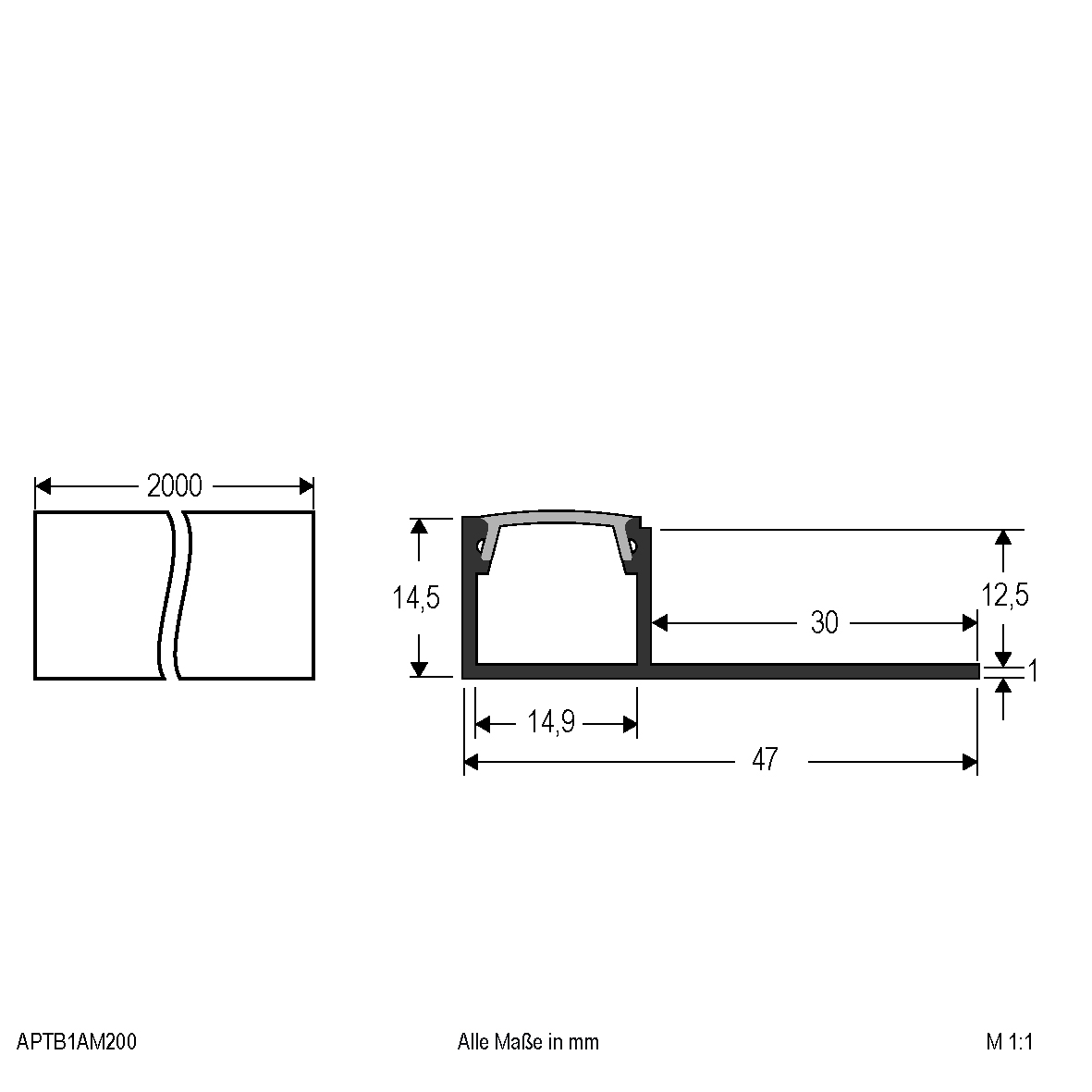 | Abmessung (LxBxH) | 2000 x 47 x 14.5 mm |