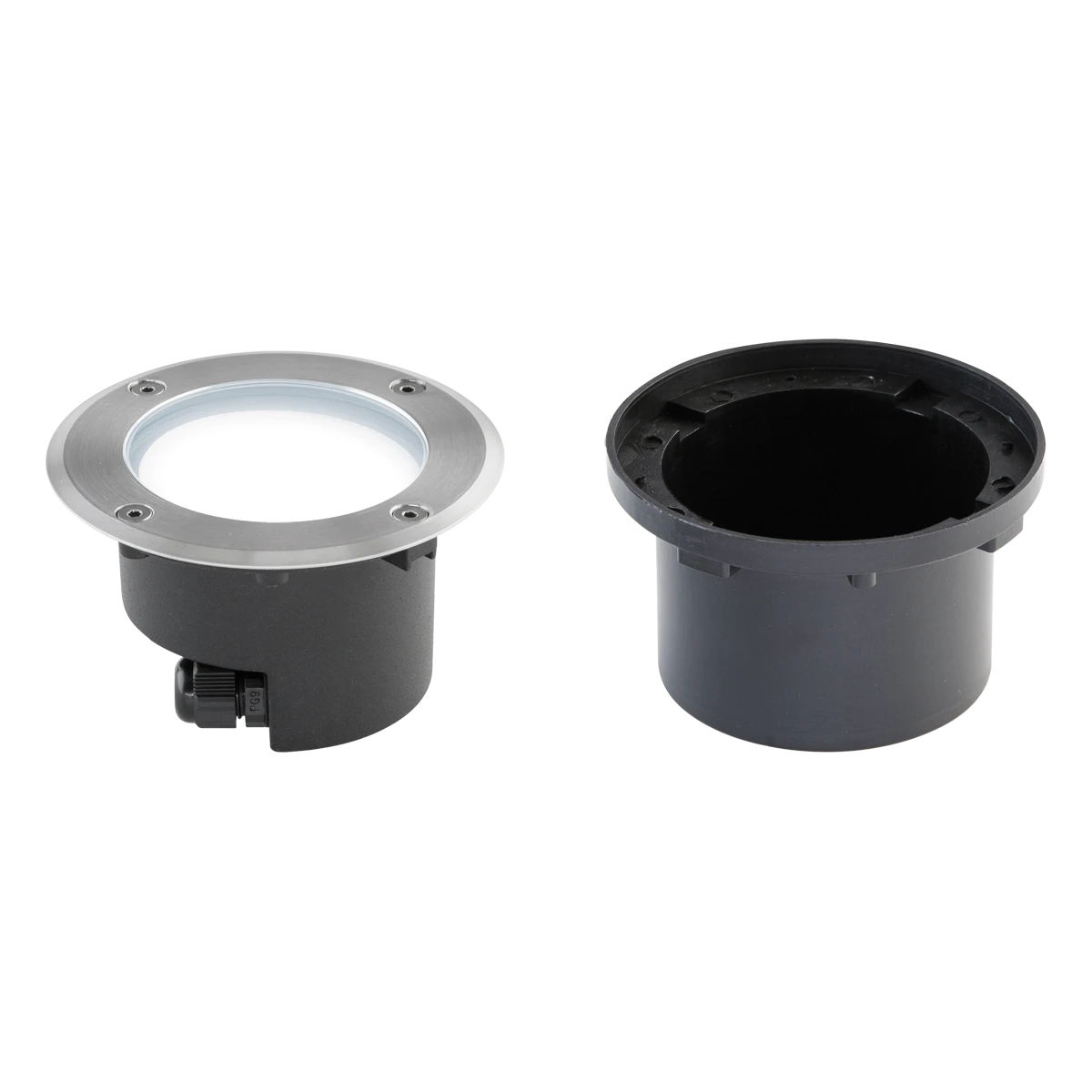 Der aus Alu-Druckguss gefertigte Leuchtenkörper ist mit Polyester überzogen, während die Abdeckplatte aus V4A-Edelstahl gefertigt ist. Durch die 2 seitlich angebrachten Kabelverschraubungen, welche für Kabel bis 9mm Durchmesser geeignet sind, ist es möglich, mehrere Leuchten durchzuverdrahten, wodurch die Installation bei längeren Leitungswegen deutlich erleichtert wird. Es besteht die Möglichkeit, die Leuchte ohne den im Lieferumfang enthaltenen Kunststoff-Einbautopf zu montieren, in diesem Fall beträgt die Einbautiefe 66mm und der benötigte Lochausschnitt 104mm. Die Kabeleinführung in den Einbautopf erfolgt von unten. Das mitgelieferte LED-Leuchtmittel kann bei Bedarf jederzeit ausgetauscht werden. Die maximale Überfahrgeschwindigkeit beträgt 25km/h.
