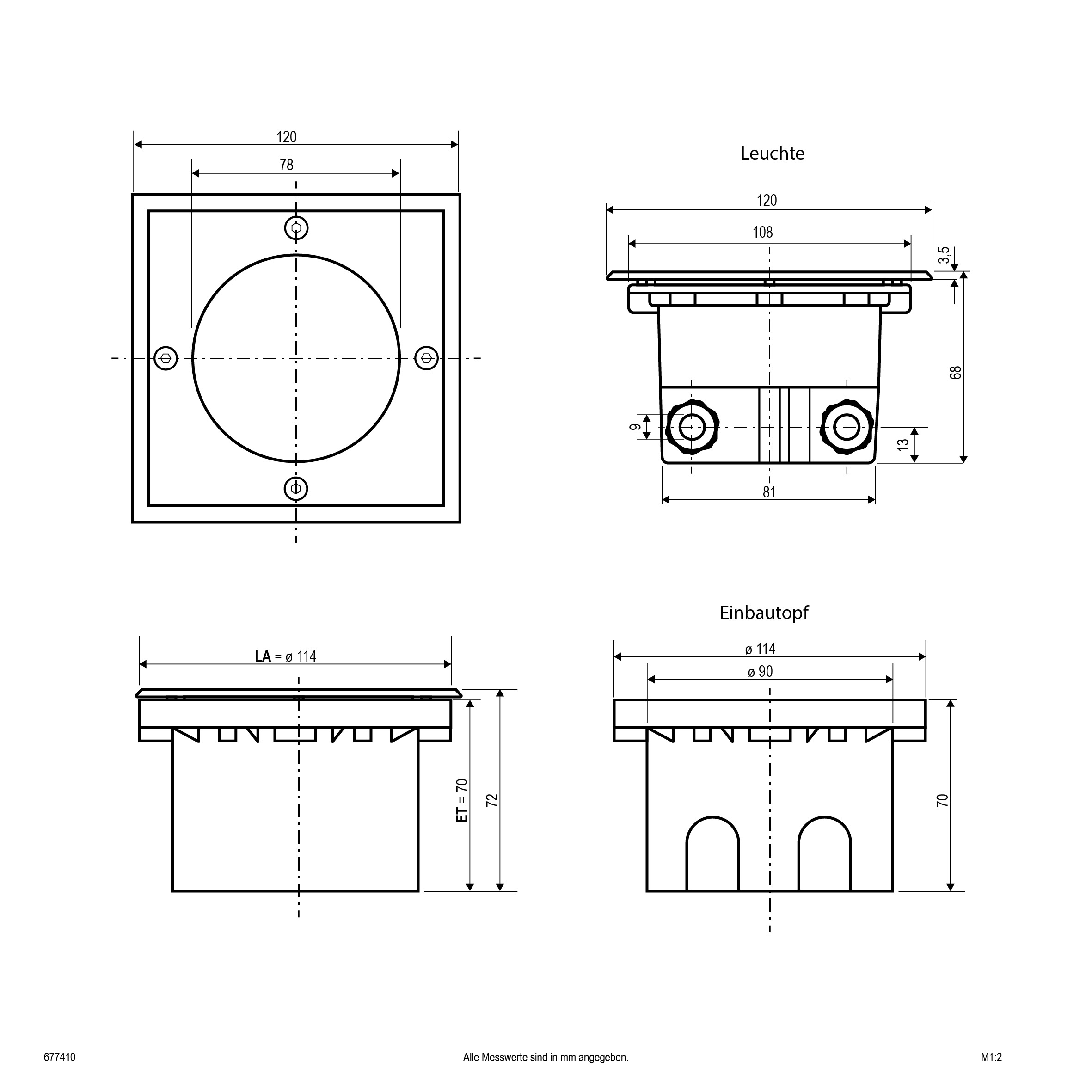 Der aus Alu-Druckguss gefertigte Leuchtenkörper ist mit Polyester überzogen, während die Abdeckplatte aus V4A-Edelstahl gefertigt ist. Durch die 2 seitlich angebrachten Kabelverschraubungen, welche für Kabel bis 9mm Durchmesser geeignet sind, ist es möglich, mehrere Leuchten durchzuverdrahten, wodurch die Installation bei längeren Leitungswegen deutlich erleichtert wird. Es besteht die Möglichkeit, die Leuchte ohne den im Lieferumfang enthaltenen Kunststoff-Einbautopf zu montieren, in diesem Fall beträgt die Einbautiefe 66mm und der benötigte Lochausschnitt 110mm. Die Kabeleinführung in den Einbautopf erfolgt von unten. Es dürfen Leuchtmittel bis max. 9W in der Leuchte betrieben werden. Die maximale Überfahrgeschwindigkeit beträgt 25km/h.