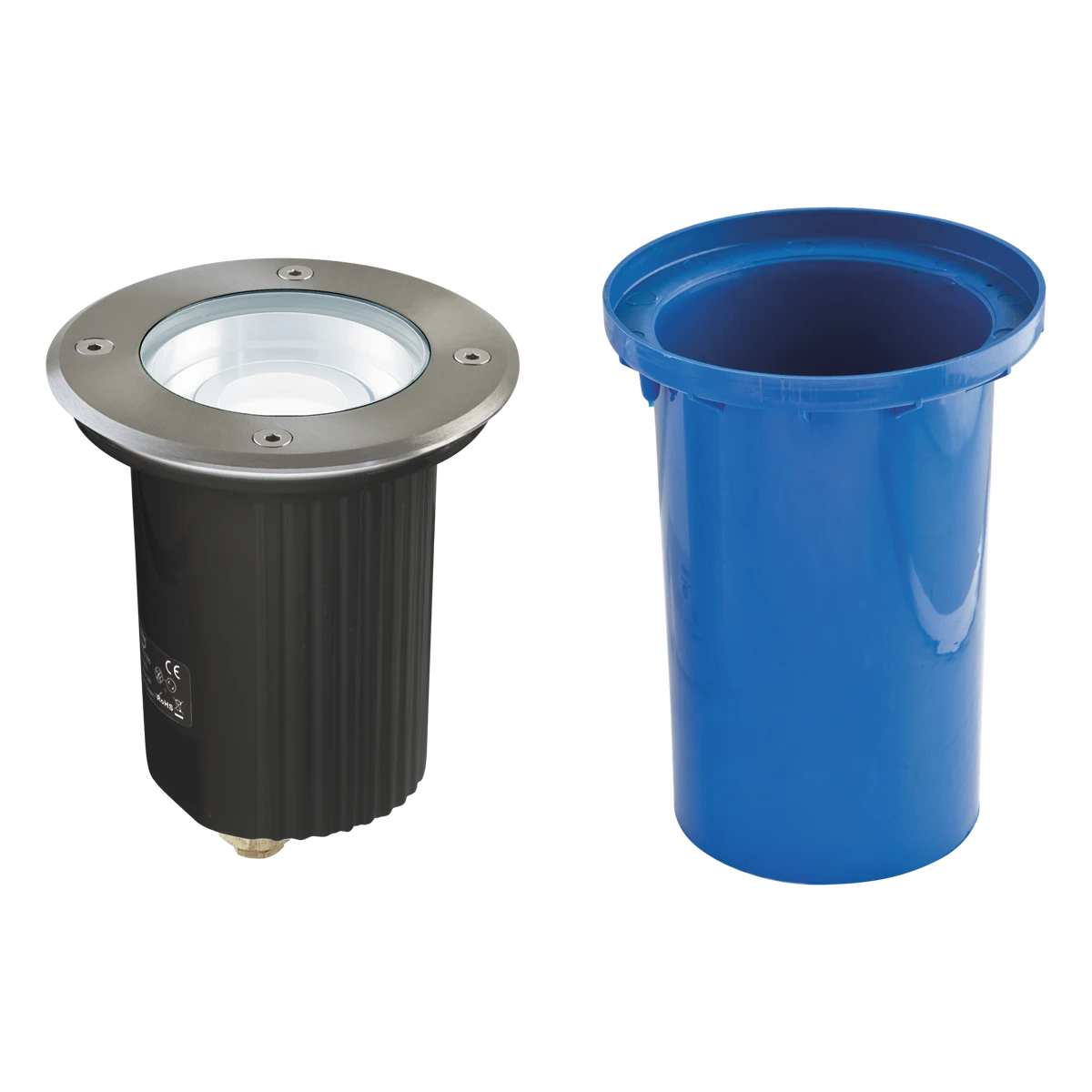 Der Leuchtenkörper ist aus Kunststoff, die Abdeckplatte hingegen aus V2A-Edelstahl gefertigt. Die Kabeleinführung erfolgt über die am Boden befindliche Kabelverschraubung, welche für Kabel bis 9mm Durchmesser geeignet ist. Die zweite im Lieferumfang befindliche Kabelverschraubung kann optional an der Leuchte angebracht werden, wodurch eine Durchverdrahtung problemlos möglich ist. Es besteht die Möglichkeit, die Leuchte ohne den im Lieferumfang enthaltenen Kunststoff-Einbautopf zu montieren, in diesem Fall beträgt die Einbautiefe 180mm und der benötigte Lochausschnitt 137mm. Das mitgelieferte LED-Leuchtmittel kann bei Bedarf jederzeit ausgetauscht werden. Die maximale Überfahrgeschwindigkeit beträgt 20km/h, der Schwenkwinkel beträgt 30°.