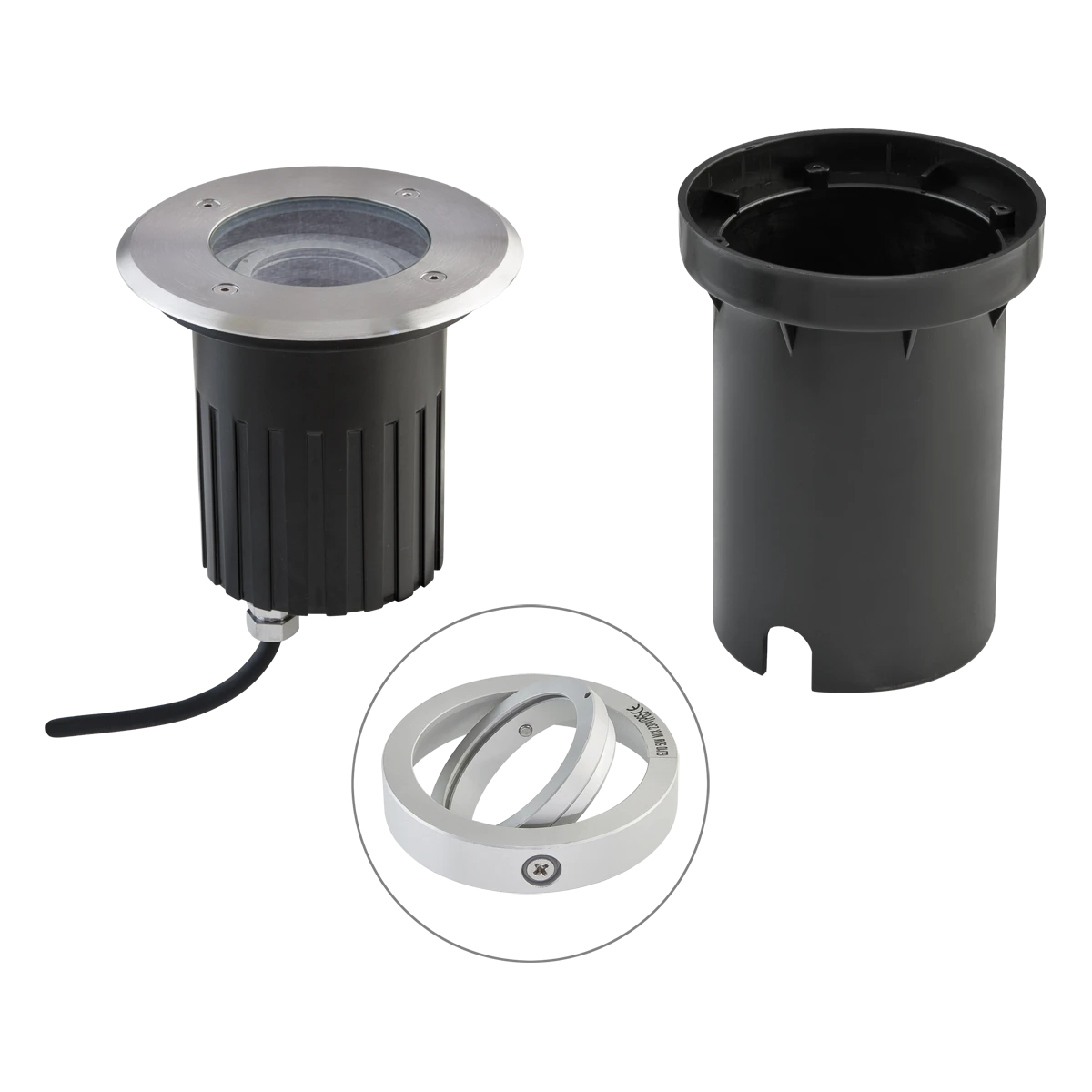 Die aus V2A-Edelstahl gefertigte Abdeckplatte sitzt auf einem Aluminium Leuchtengehäuse, welche zum Schutz vor Korrosion mit Polyester überzogen ist. Die durch eine Kabelverschraubung geführte Zuleitung hat eine Länge von 100cm. Durch die GU10 Hochvoltfassung können unterschiedliche Leuchtmittel bis max. 35W in der Leuchte betrieben werden. Die maximale Überfahrgeschwindigkeit beträgt 20km/h. Die Leuchtmittelhalterung ist drehbar in der Leuchte gelagert und besitzt einen Schwenkwinkel von 15°.