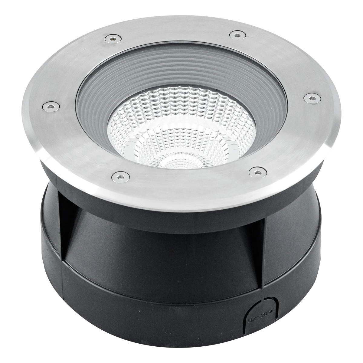 Der Leuchtenkörper der Bodeneinbauleuchte ist aus massivem Aluminium gefertigt, der obere Abdeckring hingegen aus V2A-Edelstahl und kann für vielfältige Anwendungen im Außenbereich verwendet werden. Die Montage erfolgt mittels der im Lieferumfang befindlichen Kunststoff-Einbauhülse. Da der COB-LED-Chip fest verbaut ist, fallen keine zusätzlichen Kosten für Leuchtmittel an. Ebenso entstehen auch keine zusätzlichen Kosten für ein Vorschaltgerät, da der Anschluss direkt an die 230V-Zuleitung erfolgt. Die maximale Überfahrgeschwindigkeit beträgt 20km/h. Optional sind für die Leuchte ein mattes Glas erhältlich. Die Leuchte hat eine 0,50m lange Anschlussleitung (ÖLFLEX CLASSIC 110 BLACK 3 x 0,75mm²) mit freien Aderenden. Der Ausstrahlwinkel beträgt 60°.