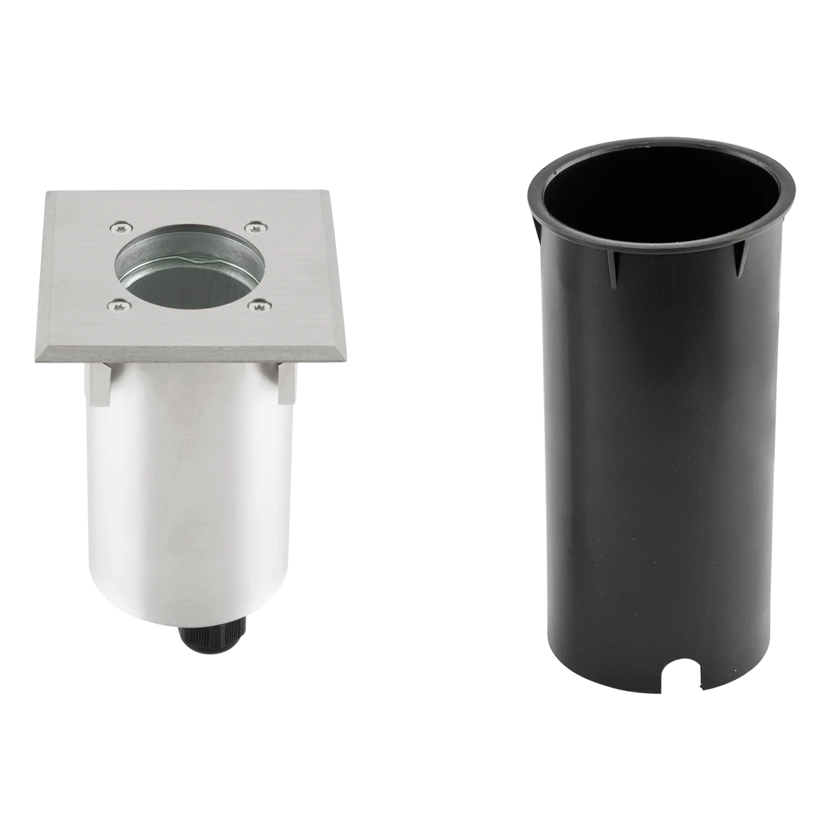 Der Leuchtenkörper ist aus massivem Aluminium, die Abdeckplatte hingegen aus V4A-Edelstahl gefertigt. Durch die 2, am Boden angebrachten Kabelverschraubungen, welche für Kabel bis 12mm Durchmesser geeignet sind, ist es möglich, mehrere Leuchten durchzuverdrahten, wodurch die Installation bei längeren Leitungswegen deutlich erleichtert wird. Es besteht die Möglichkeit, die Leuchte ohne den im Lieferumfang enthaltenen Kunststoff-Einbautopf zu montieren, in diesem Fall beträgt die Einbautiefe 160mm und der benötigte Lochausschnitt 75mm. Durch die Hochvoltfassung können unterschiedliche Leuchtmittel bis max. 35W in der Leuchte betrieben werden. Die maximale Überfahrgeschwindigkeit beträgt 20km/h.