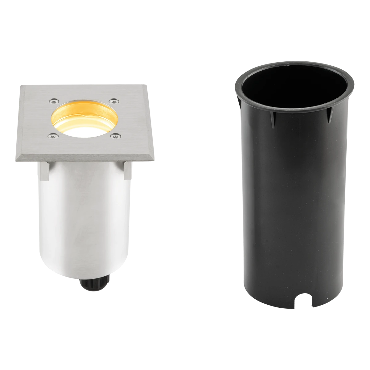 Der Leuchtenkörper ist aus massivem Aluminium, die Abdeckplatte hingegen aus V4A-Edelstahl gefertigt. Durch die 2, am Boden angebrachten Kabelverschraubungen, welche für Kabel bis 12mm Durchmesser geeignet sind, ist es möglich, mehrere Leuchten durchzuverdrahten, wodurch die Installation bei längeren Leitungswegen deutlich erleichtert wird. Es besteht die Möglichkeit, die Leuchte ohne den im Lieferumfang enthaltenen Kunststoff-Einbautopf zu montieren, in diesem Fall beträgt die Einbautiefe 160mm und der benötigte Lochausschnitt 75mm. Das mitgelieferte LED-Leuchtmittel kann bei Bedarf jederzeit ausgetauscht werden. Die maximale Überfahrgeschwindigkeit beträgt 20km/h.