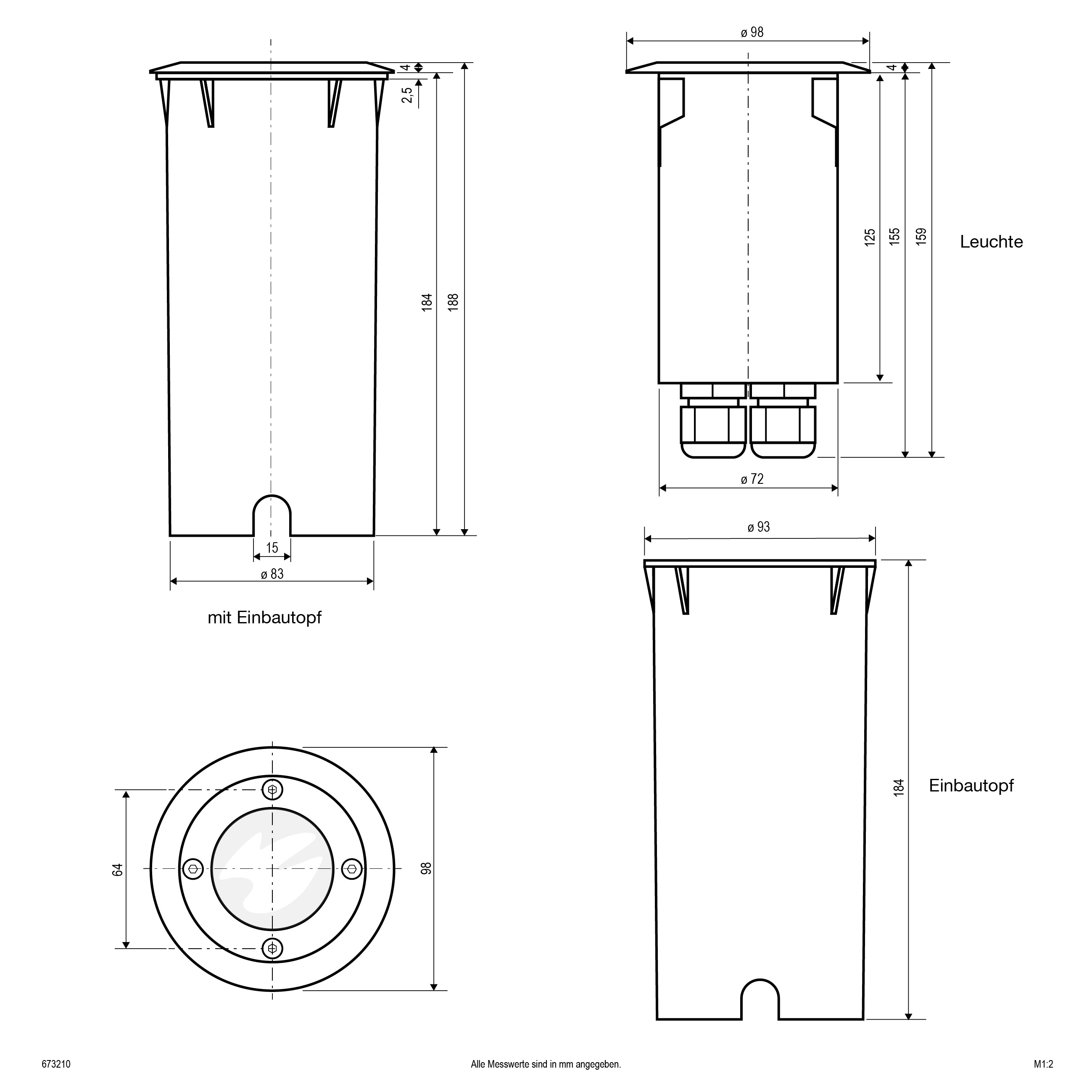 Der Leuchtenkörper ist aus massivem Aluminium, die Abdeckplatte hingegen aus V4A-Edelstahl gefertigt. Durch die 2, am Boden angebrachten Kabelverschraubungen, welche für Kabel bis 12mm Durchmesser geeignet sind, ist es möglich, mehrere Leuchten durchzuverdrahten, wodurch die Installation bei längeren Leitungswegen deutlich erleichtert wird. Es besteht die Möglichkeit, die Leuchte ohne den im Lieferumfang enthaltenen Kunststoff-Einbautopf zu montieren, in diesem Fall beträgt die Einbautiefe 160mm und der benötigte Lochausschnitt 75mm. Durch die Hochvoltfassung können unterschiedliche Leuchtmittel bis max. 35W in der Leuchte betrieben werden. Die maximale Überfahrgeschwindigkeit beträgt 20km/h.