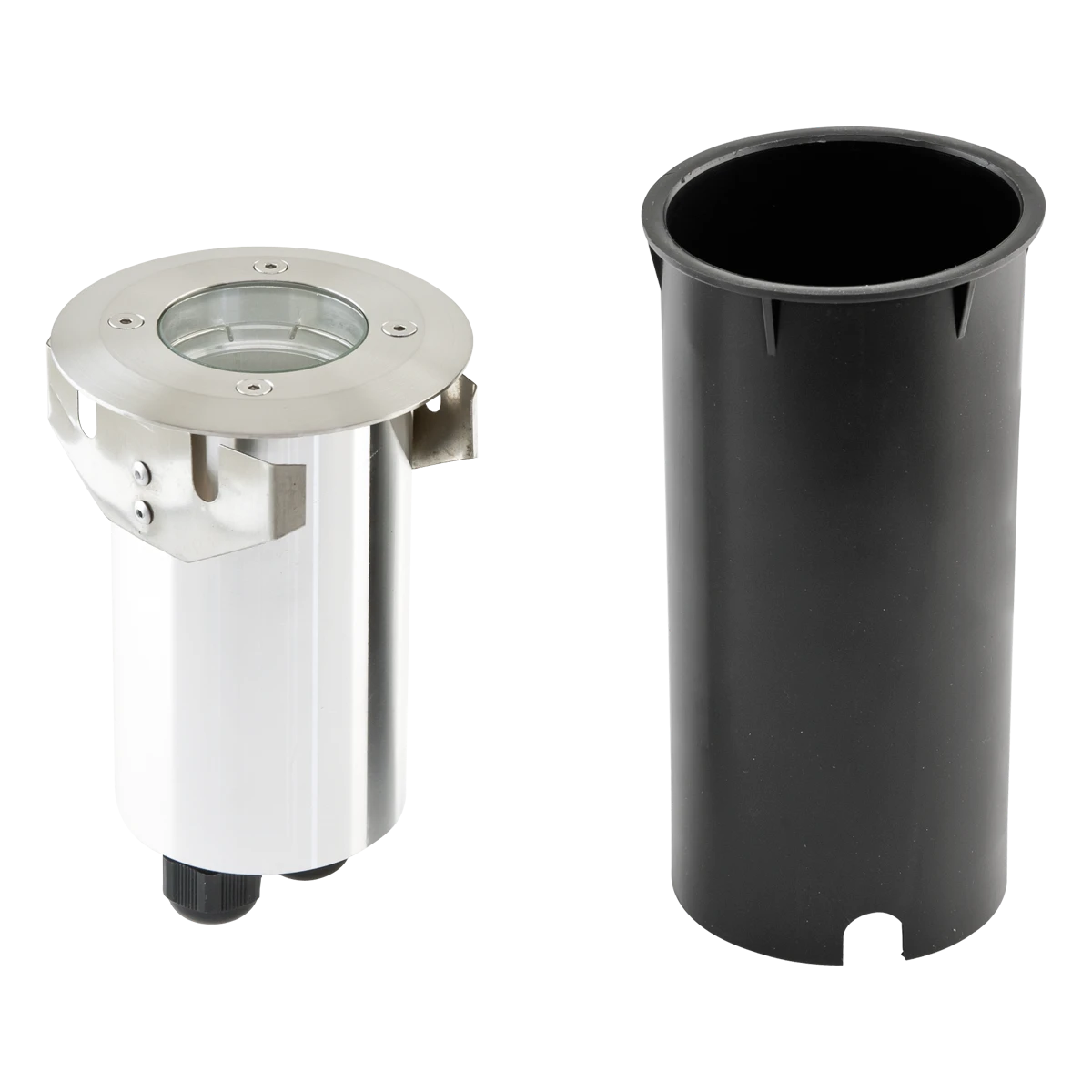 Der Leuchtenkörper ist aus massivem Aluminium, die Abdeckplatte hingegen aus V4A-Edelstahl gefertigt. Durch die 2, am Boden angebrachten Kabelverschraubungen, welche für Kabel bis 12mm Durchmesser geeignet sind, ist es möglich, mehrere Leuchten durchzuverdrahten, wodurch die Installation bei längeren Leitungswegen deutlich erleichtert wird. Es besteht die Möglichkeit, die Leuchte ohne den im Lieferumfang enthaltenen Kunststoff-Einbautopf zu montieren, in diesem Fall beträgt die Einbautiefe 160mm und der benötigte Lochausschnitt 75mm. Durch die Niedervoltfassung können unterschiedliche Leuchtmittel bis max. 35W in der Leuchte betrieben werden. Die maximale Überfahrgeschwindigkeit beträgt 20km/h.