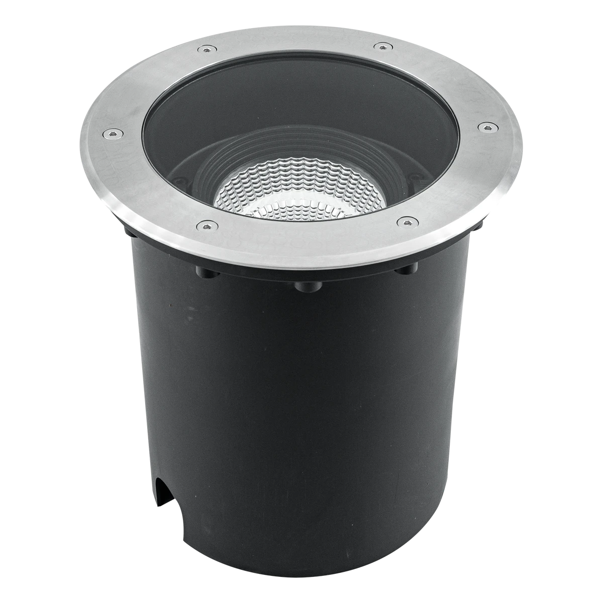 Der Leuchtenkörper der Bodeneinbauleuchte ist aus massivem Aluminium gefertigt, der obere Abdeckring hingegen aus V2A-Edelstahl und kann für vielfältige Anwendungen im Außenbereich verwendet werden. Die Montage erfolgt mittels der im Lieferumfang befindlichen Kunststoff-Einbauhülse. Über eine Justierschraube auf der Unterseite der Leuchte wird der gewünschte Schwenkwinkel eingestellt, somit muss die Leuchte selbst nicht geöffnet werden. Außerdem entstehen auch keine zusätzlichen Kosten für ein Vorschaltgerät, da der Anschluss direkt an die 230V-Zuleitung erfolgt. Zur Vermeidung von Kondenswasser befindet sich auf der Unterseite der Leuchte ein selbstentlüftendes Entlüftungsventil. Die Leuchte hat eine 0,50m lange Anschlussleitung (ÖLFLEX CLASSIC 110 BLACK 3 x 0,75mm²) mit freien Aderenden. Die maximale Überfahrgeschwindigkeit beträgt 20km/h. Der Ausstrahlwinkel beträgt 60°. Der Schwenkwinkel beträgt 25°.