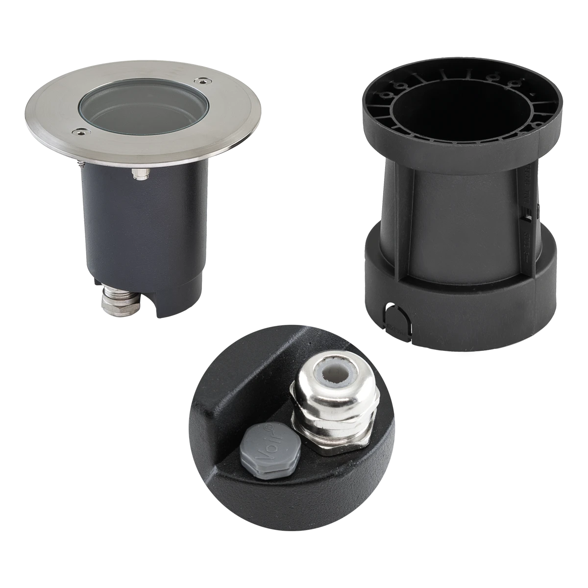 Der Leuchtenkörper ist aus Aluminium, die Abdeckplatte hingegen aus V2A-Edelstahl gefertigt. Die Kabeleinführung erfolgt über die am Boden befindliche Kabelverschraubung, welche für Kabel bis 9mm Durchmesser geeignet ist. Zur Vermeidung von Kondenswasser befindet sich auf der Unterseite der Leuchte ein selbstentlüftendes Entlüftungsventil. Es besteht die Möglichkeit, die Leuchte ohne den im Lieferumfang enthaltenen Kunststoff-Einbautopf zu montieren, in diesem Fall beträgt der Lochausschnitt 96mm während die Einbautiefe unverändert bleibt. Durch die GU10 Hochvoltfassung können unterschiedliche Leuchtmittel bis max. 35W in der Leuchte betrieben werden. Die maximale Überfahrgeschwindigkeit beträgt 20km/h, der Schwenkwinkel beträgt 10°. Zusätzlich ist ein mattes Schutzglas im Lieferumfang enthalten.
