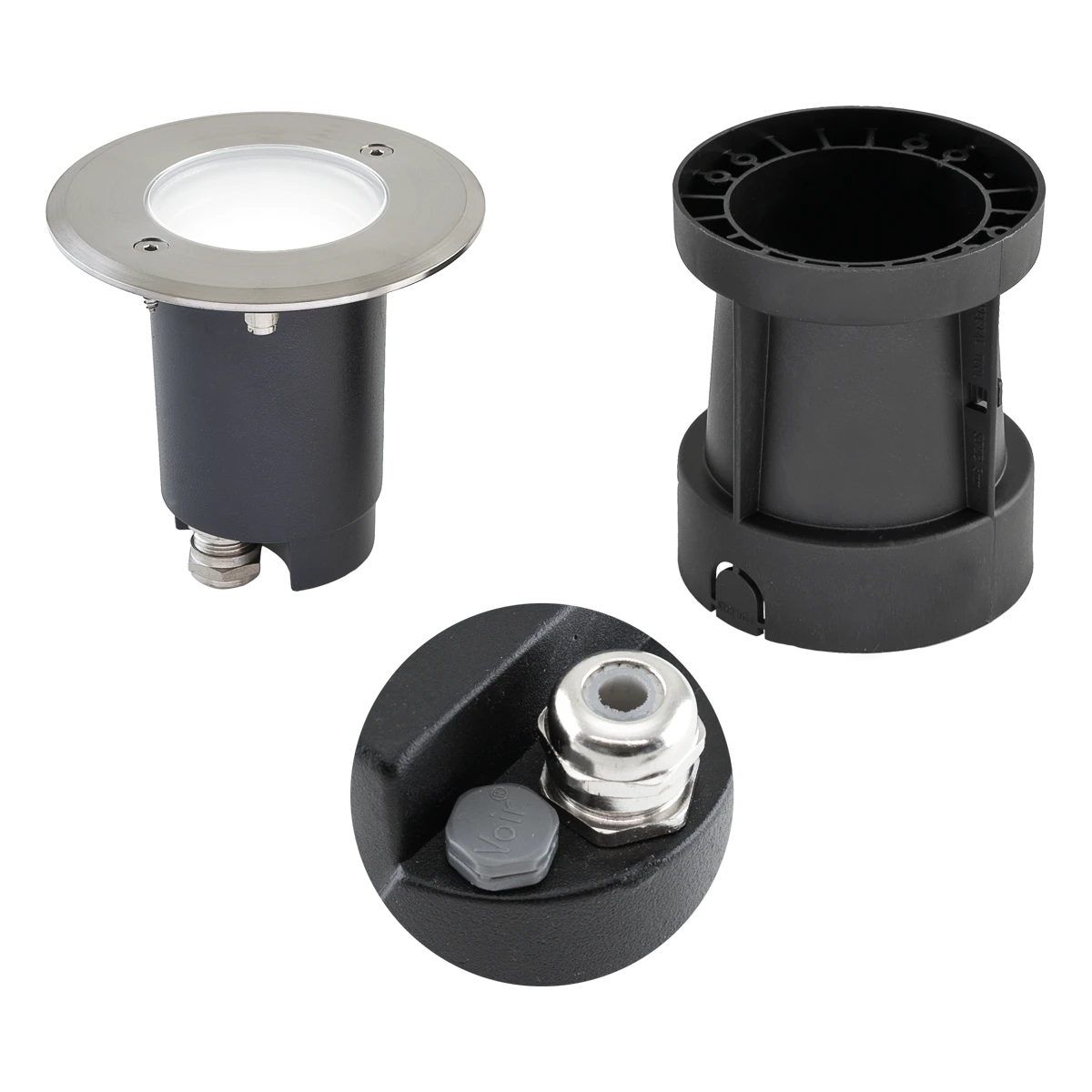 Der Leuchtenkörper ist aus Aluminium, die Abdeckplatte hingegen aus V2A-Edelstahl gefertigt. Die Kabeleinführung erfolgt über die am Boden befindliche Kabelverschraubung, welche für Kabel bis 9mm Durchmesser geeignet ist. Zur Vermeidung von Kondenswasser befindet sich auf der Unterseite der Leuchte ein selbstentlüftendes Entlüftungsventil. Es besteht die Möglichkeit, die Leuchte ohne den im Lieferumfang enthaltenen Kunststoff-Einbautopf zu montieren, in diesem Fall beträgt der Lochausschnitt 96mm während die Einbautiefe unverändert bleibt. Das mitgelieferte GU10-LED-Leuchtmittel kann bei Bedarf jederzeit ausgetauscht werden. Die maximale Überfahrgeschwindigkeit beträgt 20km/h, der Schwenkwinkel beträgt 10°. Zusätzlich ist ein mattes Schutzglas im Lieferumfang enthalten.