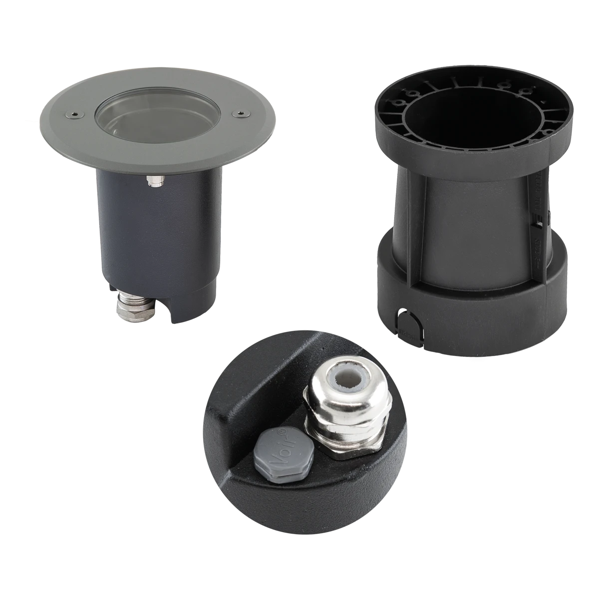 Der Leuchtenkörper ist aus Aluminium, die Abdeckplatte hingegen aus V2A-Edelstahl gefertigt. Die Kabeleinführung erfolgt über die am Boden befindliche Kabelverschraubung, welche für Kabel bis 9mm Durchmesser geeignet ist. Zur Vermeidung von Kondenswasser befindet sich auf der Unterseite der Leuchte ein selbstentlüftendes Entlüftungsventil. Es besteht die Möglichkeit, die Leuchte ohne den im Lieferumfang enthaltenen Kunststoff-Einbautopf zu montieren, in diesem Fall beträgt der Lochausschnitt 96mm während die Einbautiefe unverändert bleibt. Durch die GU10 Hochvoltfassung können unterschiedliche Leuchtmittel bis max. 35W in der Leuchte betrieben werden. Der Schwenkwinkel beträgt 10°. Zusätzlich ist ein mattes Schutzglas im Lieferumfang enthalten.
