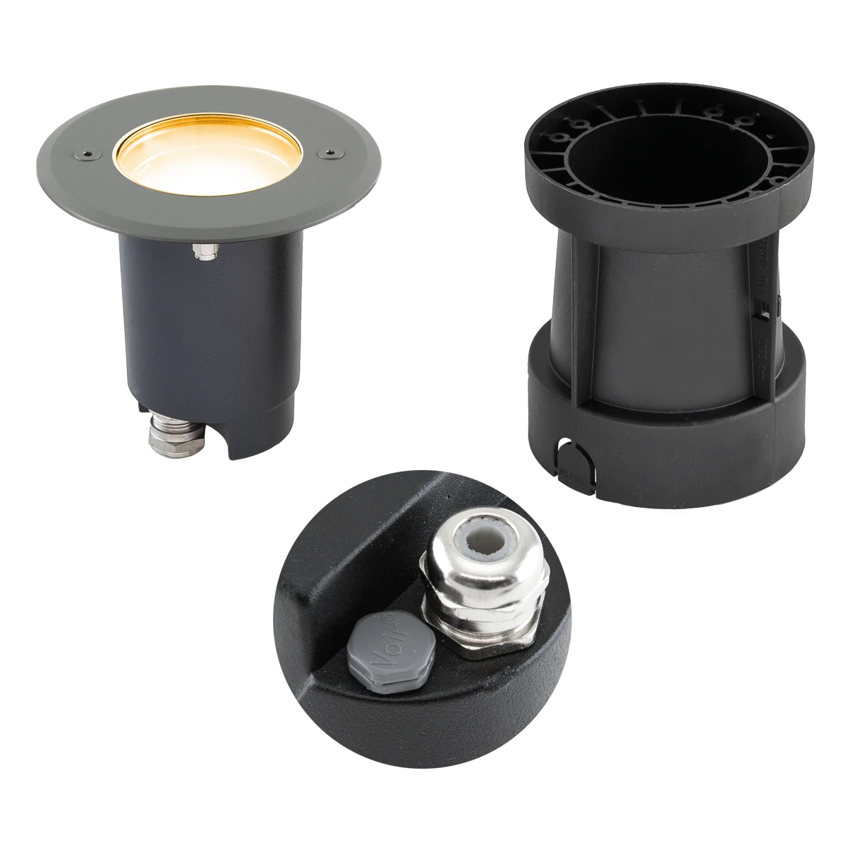 Der Leuchtenkörper ist aus Aluminium, die Abdeckplatte hingegen aus V2A-Edelstahl gefertigt. Die Kabeleinführung erfolgt über die am Boden befindliche Kabelverschraubung, welche für Kabel bis 9mm Durchmesser geeignet ist. Zur Vermeidung von Kondenswasser befindet sich auf der Unterseite der Leuchte ein selbstentlüftendes Entlüftungsventil. Es besteht die Möglichkeit, die Leuchte ohne den im Lieferumfang enthaltenen Kunststoff-Einbautopf zu montieren, in diesem Fall beträgt der Lochausschnitt 96mm während die Einbautiefe unverändert bleibt. Das mitgelieferte GU10-LED-Leuchtmittel kann bei Bedarf jederzeit ausgetauscht werden. Der Schwenkwinkel beträgt 10°. Zusätzlich ist ein mattes Schutzglas im Lieferumfang enthalten.