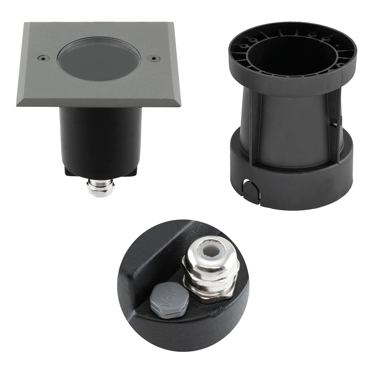 Der Leuchtenkörper ist aus Aluminium, die Abdeckplatte hingegen aus V2A-Edelstahl gefertigt. Die Kabeleinführung erfolgt über die am Boden befindliche Kabelverschraubung, welche für Kabel bis 9mm Durchmesser geeignet ist. Es besteht die Möglichkeit, die Leuchte ohne den im Lieferumfang enthaltenen Kunststoff-Einbautopf zu montieren, in diesem Fall beträgt der Lochausschnitt 96mm während die Einbautiefe unverändert bleibt. Durch die GU10 Hochvoltfassung können unterschiedliche Leuchtmittel bis max. 35W in der Leuchte betrieben werden. Der Schwenkwinkel beträgt 10°. Zusätzlich ist ein mattes Schutzglas im Lieferumfang enthalten.