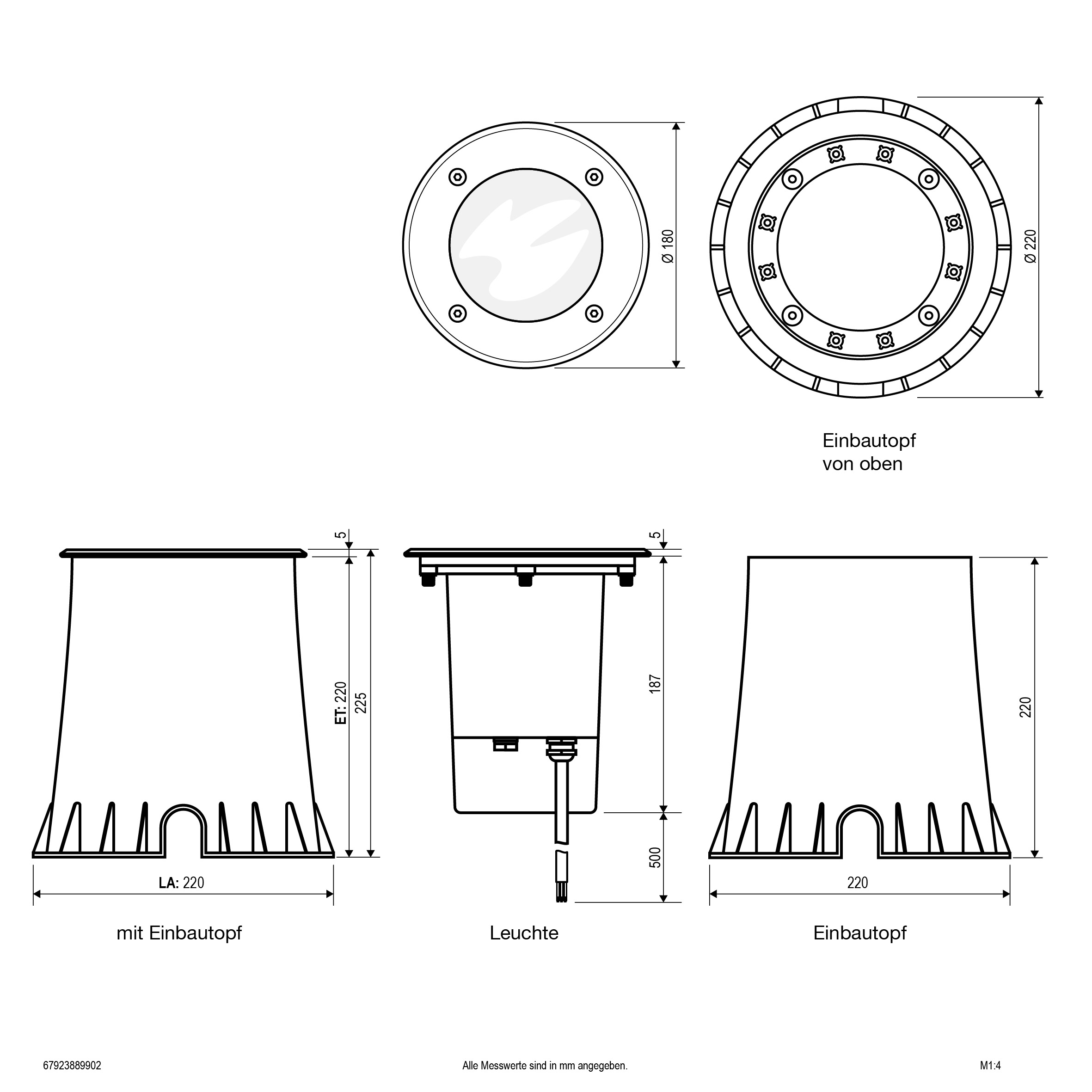 Der Leuchtenkörper ist aus Aluminium, die Abdeckplatte hingegen aus V2A-Edelstahl gefertigt. Die Kabeleinführung erfolgt über die am Boden befindliche Kabelverschraubung, welche für Kabel bis 10mm Durchmesser geeignet ist. Zur Vermeidung von Kondenswasser befindet sich auf der Unterseite der Leuchte ein selbstentlüftendes Entlüftungsventil. Der mitgelieferte RGBW-LED-Einsatz wird über einen externen RGBW-Controller gesteuert, somit können mehrere Leuchten synchron über einen Controller gesteuert werden. Das Modul ist mit RGBW-Chips ausgestattet, wodurch die Lichtfarbe Weiß nicht auch den RGB-Farben generiert werden muss und sich außerdem separat oder aber in Verbindung mit den RGB-Farben, für ein erweitertes Farbspektrum, schalten lässt. Außerdem hat das RGBW-Modul keinen klassischen Sockel, sondern eine Anschlussleitung, womit dieses am Controller angeschlossen wird. Die angegebenen Lumen werden bei Betrieb im weiß-Modus erreicht. Die Lumen der Einzelfarben sind: rot: 228lm, grün: 330lm, blau: 78lm. Die maximale Überfahrgeschwindigkeit beträgt 20km/h, der Schwenkwinkel beträgt 20°. Außerdem ist die Leuchtmittelaufnahme drehbar gelagert. Zusätzlich ist ein mattes Schutzglas im Lieferumfang enthalten. Sowohl das Betriebsgerät, als auch der RGB-Controller sind separat erhältlich.