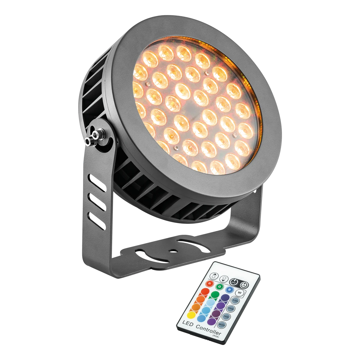 Der RGB-LED Wallpainter kann für unterschiedlichste Beleuchtungsaufgaben im Außen- und Innenbereich verwendet werden. Aufgrund der 36 verbauten Multicolor-LED-chips wird ein sehr gleichmäßiges und homogenes Lichtbild erreicht, somit können auch große Flächen optimal ausgeleuchtet werden. Der Fluter besitzt einen Schwenkbereich von 180°. Zur Vermeidung von Kondenswasser verfügt der Wallwasher über ein selbstentlüftendes Entlüftungsventil an der Rückseite. Da sowohl das Vorschaltgerät, als auch die Steuerung integriert sind, kann der Fluter direkt an die 230V-Zuleitung angeschlossen werden. Der Betrieb des mitgelieferten Funk-Handsenders (433,2 MHz) erfolgt mit 1x CR2025 3V Batterie (nicht im Lieferumfang enthalten). Die Lichtausbeute beträgt 291lm (Rot), 764lm (Grün), 245lm (Blau), 1275lm (weiß).