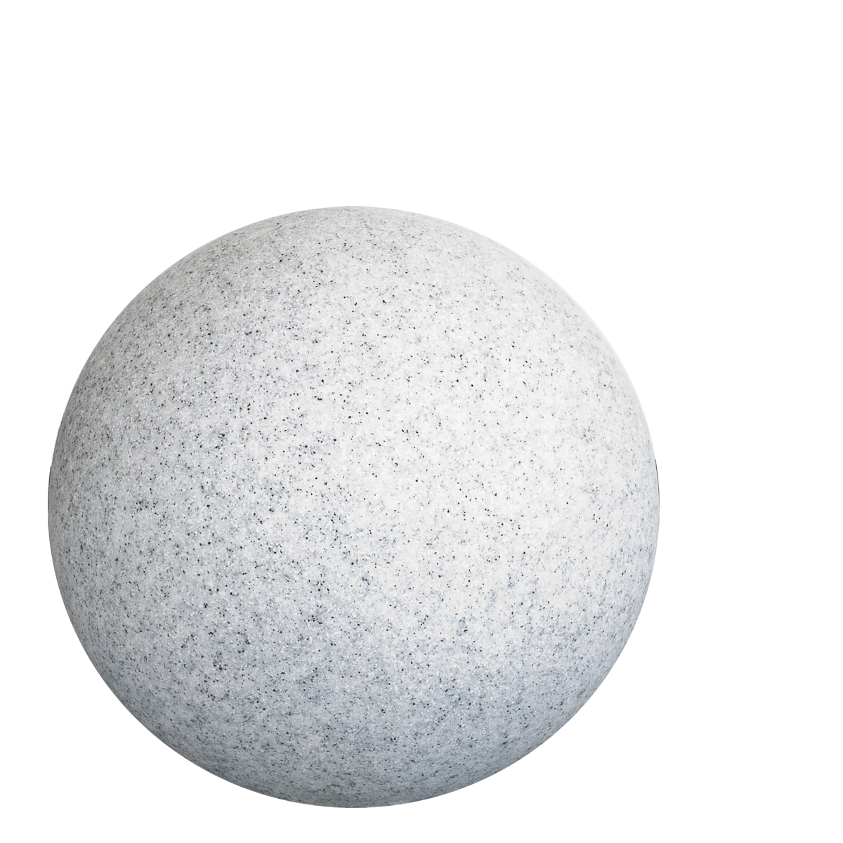 Dekorative Kugelleuchte für den Außenbereich aus Kunststoff in Stein-Design. Dank der E-27 Fassung können sowohl LED-Leuchtmittel bis max. 10W, als auch Energiesparleuchtmittel bis max. 25W eingesetzt werden. Je nach verwendetem Leuchtmittel lassen sich die unterschiedlichsten Effekte erzielen. Da die Kugelleuchte noch in zwei weiteren Größen erhältlich ist, lassen sich auch kleine Gruppen der Leuchten als absoluter Blickfang zusammen platzieren. Dank des im Lieferumfang enthaltenen Erdspieß hat die Kugel jederzeit einen sicheren Stand. Die 2m lange Anschlussleitung ist mit einem Konturenstecker versehen. Die ta beträgt -20°C - 50°C.