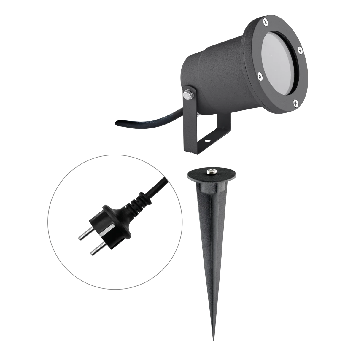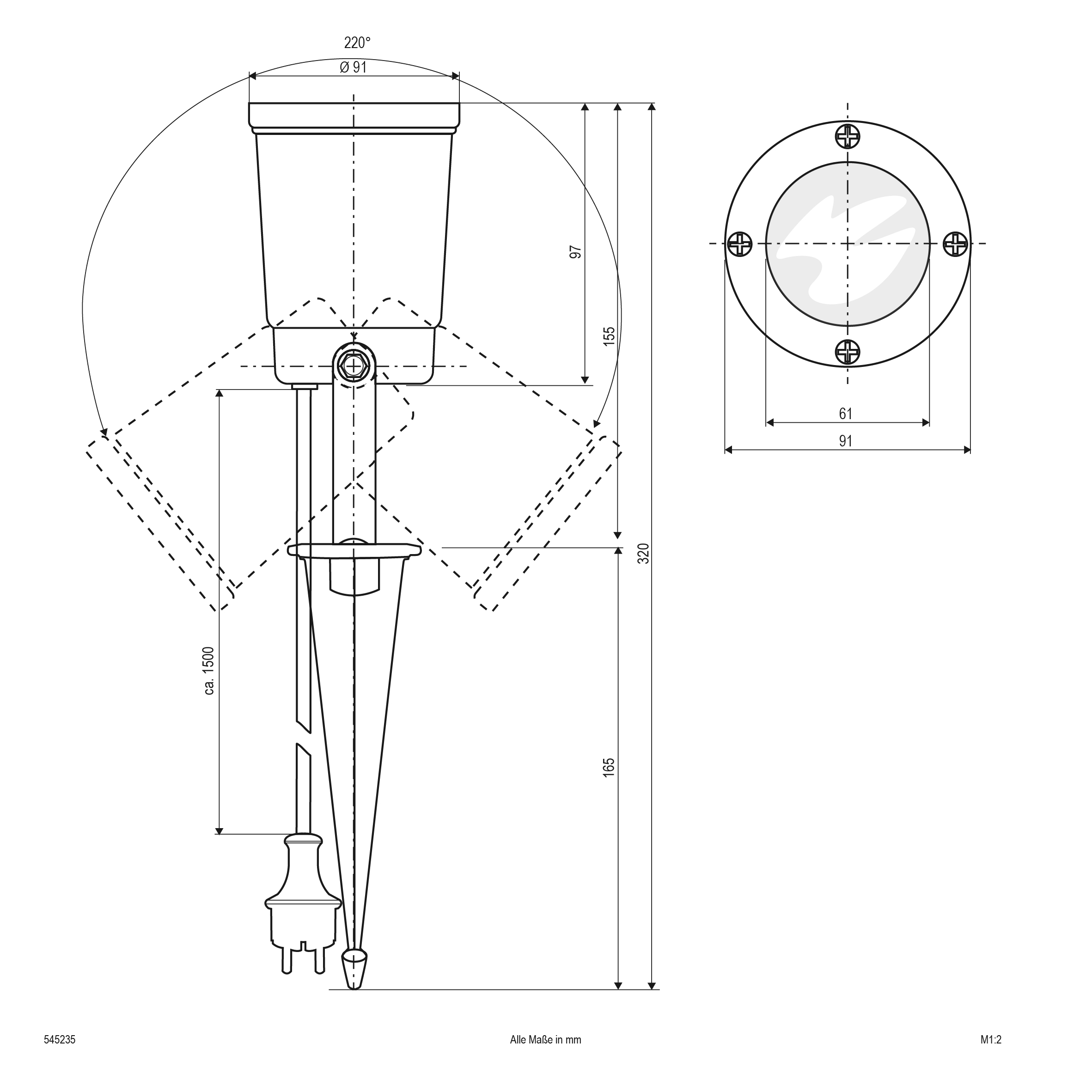 Die Leuchte kann entweder mittels des montierten Bügels direkt auf dem Untergrund, oder optional mit dem mitgeliefertem Erdspieß im weichen Untergrund montiert werden. Am Strahler befindet sich eine 1,5m lange Anschlussleitung mit Schutzkontaktstecker. Die Kabeleinführung in die Leuchte erfolgt durch eine Kabelverschraubung. Die Leuchte kann mit den unterschiedlichsten Leuchtmitteln bestückt werden. Die Leuchte hat mit Montagebügel eine Länge von 155mm im ungeschwenkten Zustand, der mitgelieferte Erdspieß hat eine Länge von 165mm, der Schwenkwinkel beträgt 110°.