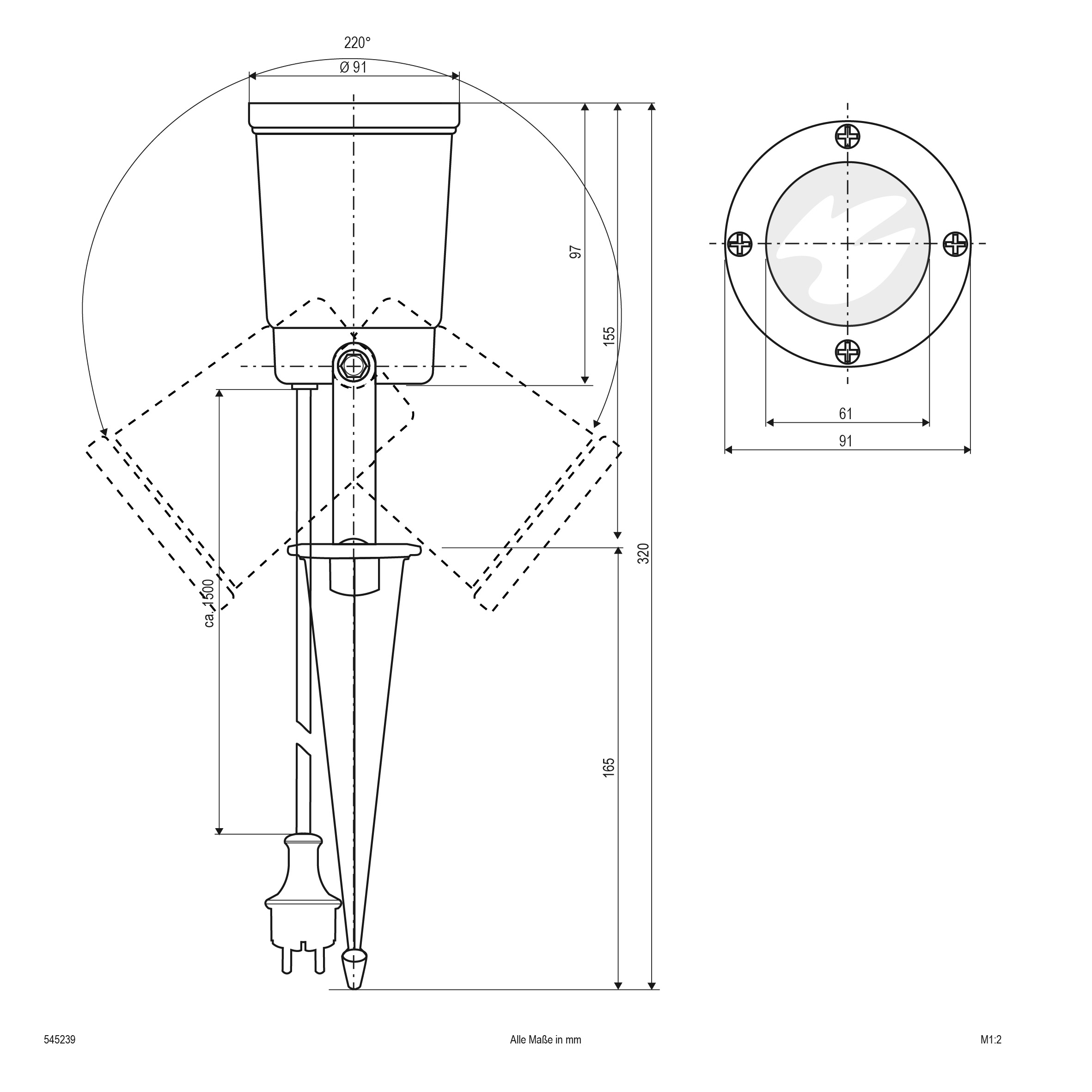 Die Leuchte kann entweder mittels des montierten Bügels direkt auf dem Untergrund, oder optional mit dem mitgeliefertem Erdspieß im weichen Untergrund montiert werden. Am Strahler befindet sich eine 1,5m lange Anschlussleitung mit Schutzkontaktstecker. Die Kabeleinführung in die Leuchte erfolgt durch eine Kabelverschraubung. Die Leuchte kann mit den unterschiedlichsten Leuchtmitteln bestückt werden. Die Leuchte hat mit Montagebügel eine Länge von 155mm im ungeschwenkten Zustand, der mitgelieferte Erdspieß hat eine Länge von 165mm, der Schwenkwinkel beträgt 110°.