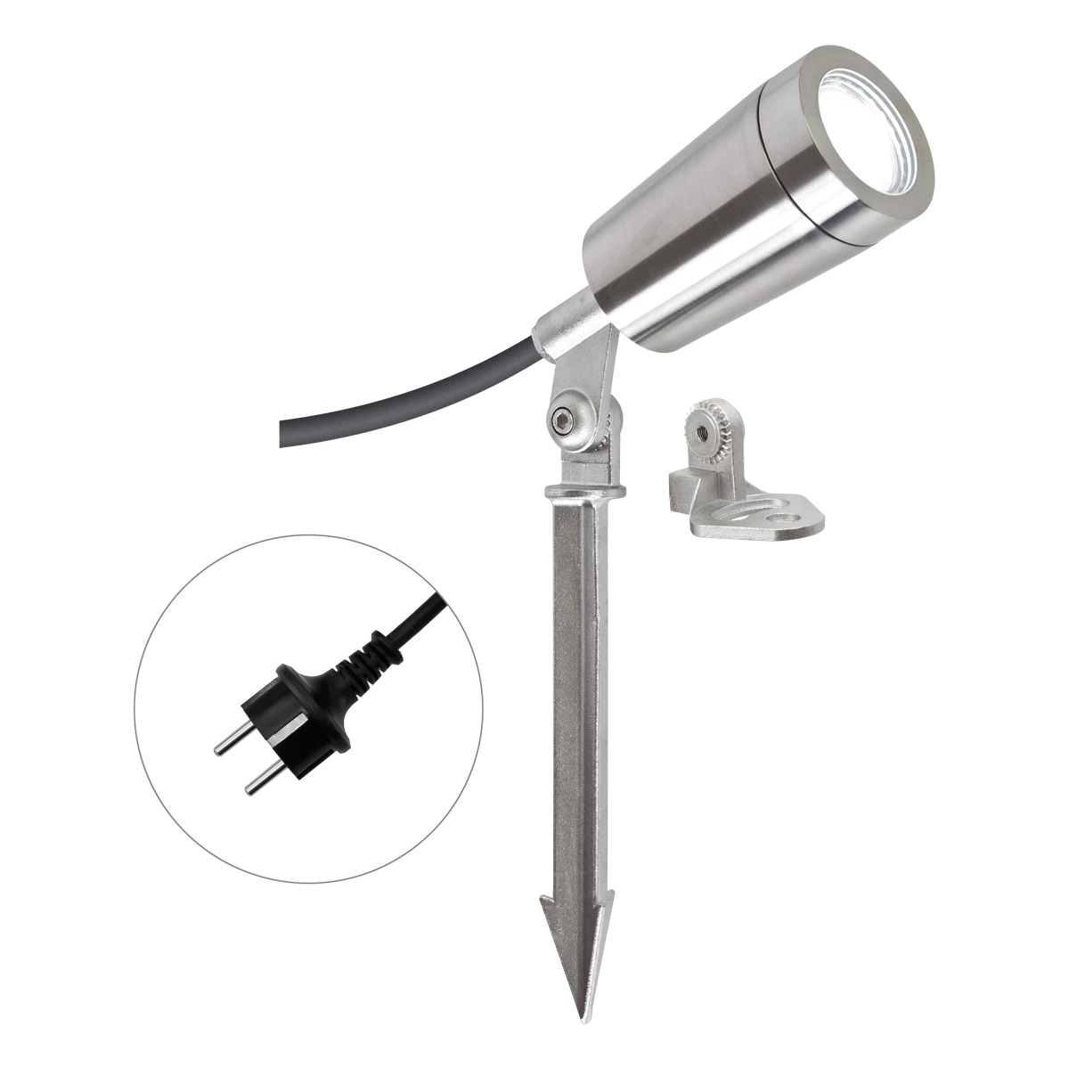 Die V4A-Edelstahl Leuchte kann entweder mittels des montierten Edelstahl-Stativs direkt auf dem Untergrund, oder optional mit dem mitgeliefertem Erdspieß im weichen Untergrund montiert werden. Am Strahler befindet sich eine 1,7m lange Anschlussleitung mit einen Schutzkontaktstecker. Der Erdspieß hat eine Länge von 195mm.