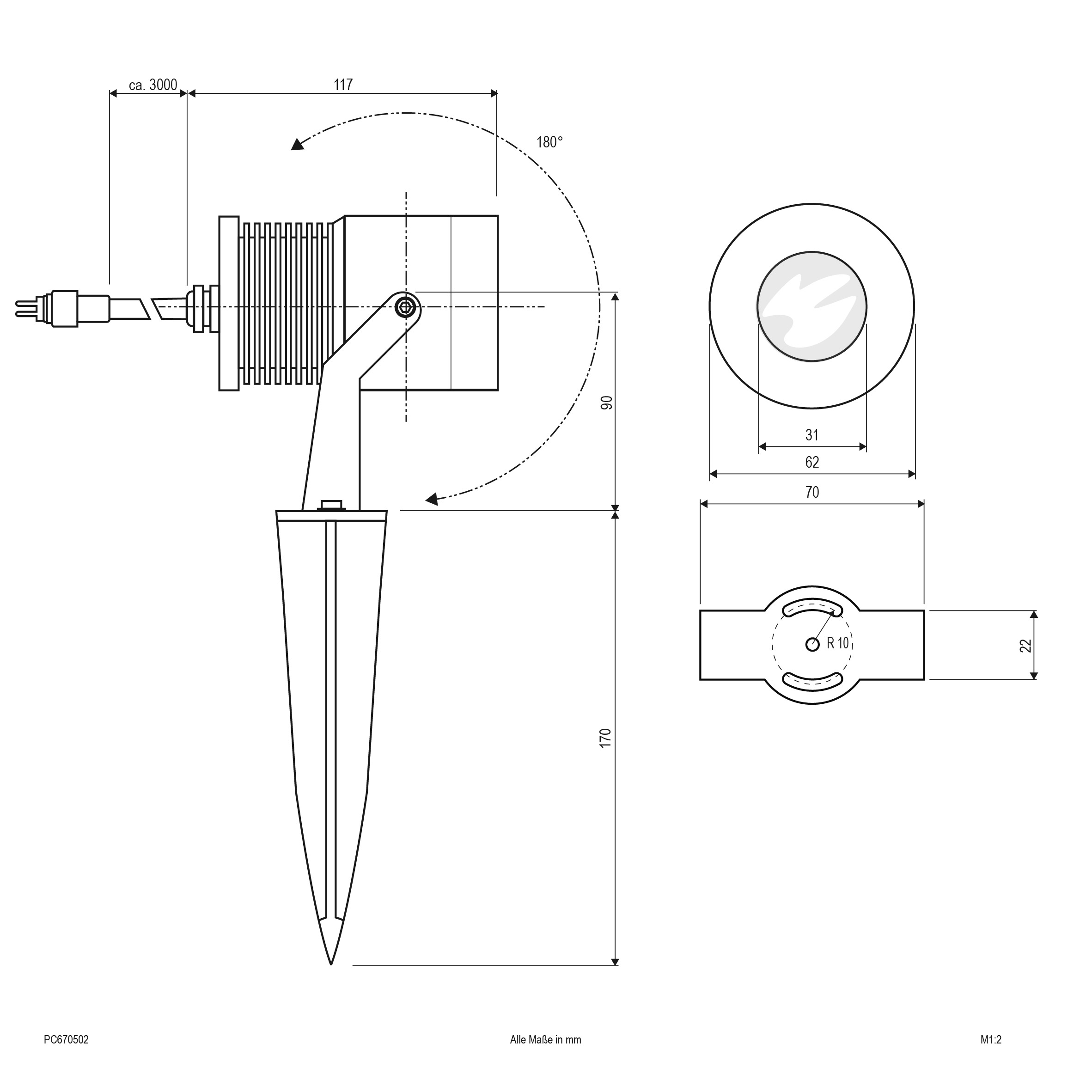Die Leuchte kann entweder mittels des montierten Bügels direkt auf dem Untergrund, oder optional mit dem mitgeliefertem Erdspieß im weichen Untergrund montiert werden. Am Strahler befindet sich eine 3m lange Anschlussleitung mit Stecker für das IP44-Stecksystem. Die Kabeleinführung in die Leuchte erfolgt durch eine Kabelverschraubung. Dank der Vorbereitung für das Stecksystem, können problemlos auch größere Anlagen schnell und einfach installiert werden. Mit montiertem Erdspieß hat die Leuchte einen Drehbereich von 90°. Der Schwenkwinkel der Leuchte beträgt 45°. Der Erdspieß hat eine Länge von 170mm.