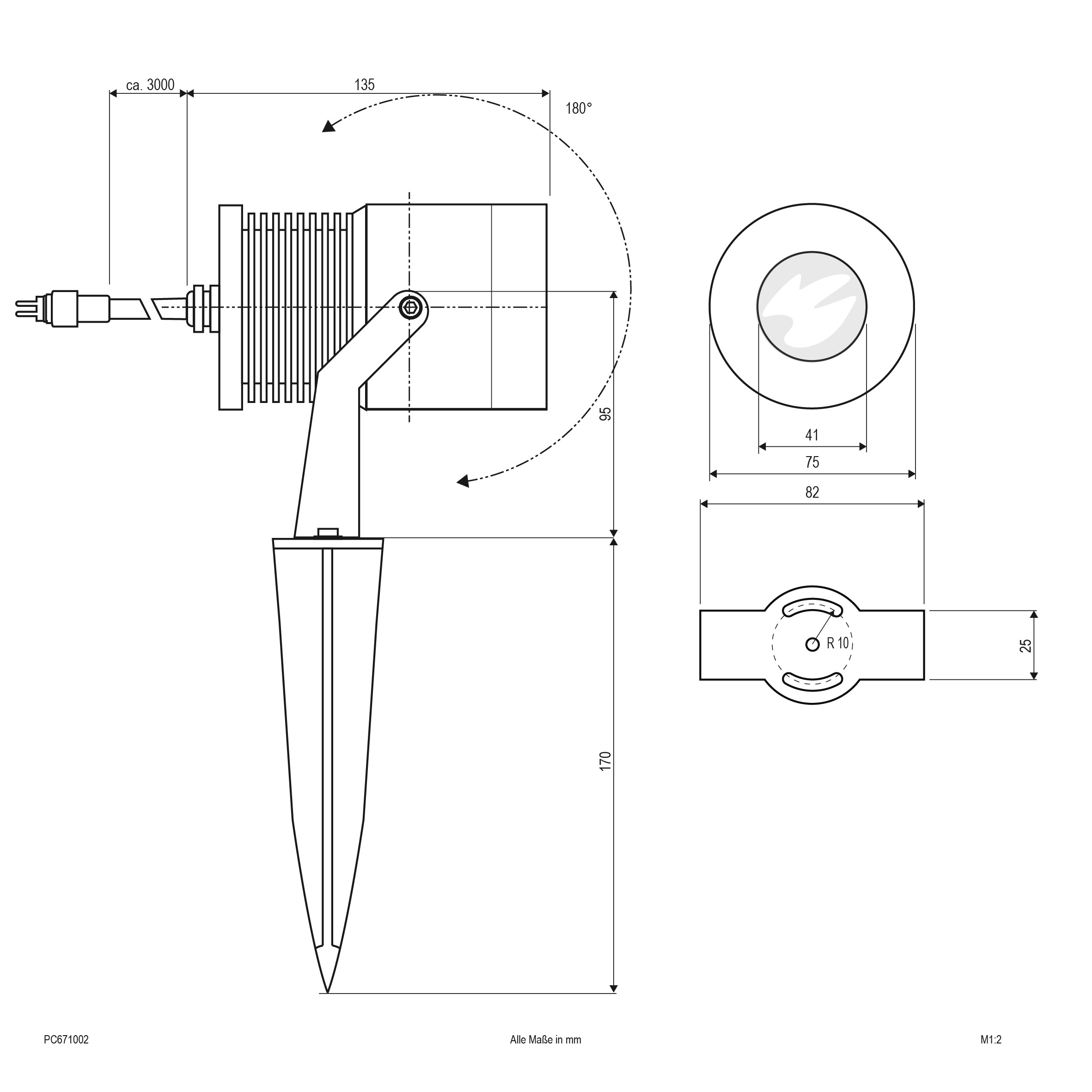 Die Leuchte kann entweder mittels des montierten Bügels direkt auf dem Untergrund, oder optional mit dem mitgeliefertem Erdspieß im weichen Untergrund montiert werden. Am Strahler befindet sich eine 3m lange Anschlussleitung mit Stecker für das IP44-Stecksystem. Die Kabeleinführung in die Leuchte erfolgt durch eine Kabelverschraubung. Dank der Vorbereitung für das Stecksystem, können problemlos auch größere Anlagen schnell und einfach installiert werden. Mit montiertem Erdspieß hat die Leuchte einen Drehbereich von 90°. Der Schwenkwinkel der Leuchte beträgt 45°. Der Erdspieß hat eine Länge von 170mm.