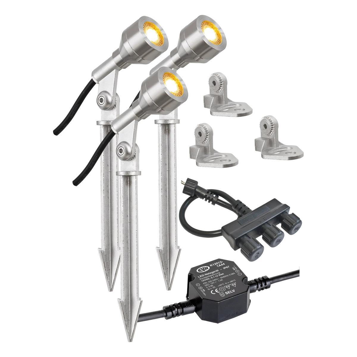 Die massiven LED-Strahler können für vielfältige Anwendungen zum Einsatz gebracht werden. Da im Lieferumfang für jeden Spot sowohl ein Stativ (Montagefuß), als auch ein Erdspieß enthalten sind, können die Spots nahezu überall montiert werden. Aufgrund der gegebenen Schutzart ist sogar der Einsatz unter Wasser bis zu einer Tauchtiefe von 1,5m möglich. Das komplette Set wird über das IP44-Stecksystem einfach verkabelt. An jedem Spot befindet sich eine 5m lange Anschlussleitung. Außerdem befindet sich im Set ein 3-fach-verteiler, sowie das Vorschaltgerät, welches eine 1,8m lange Zuleitung mit Netzstecker hat. Sowohl der Erdspieß, als auch das Stativ sind mit einem feinen Zahnraster versehen, um ein ungewolltes schwenken des Spots zu verhindern. Der Schwenkwinkel beträgt 60°. Bei Bedarf können die mitgelieferten LED-Leuchtmittel natürlich jederzeit ausgetauscht werden. Die technischen Daten beziehen sich auf einen Spot.