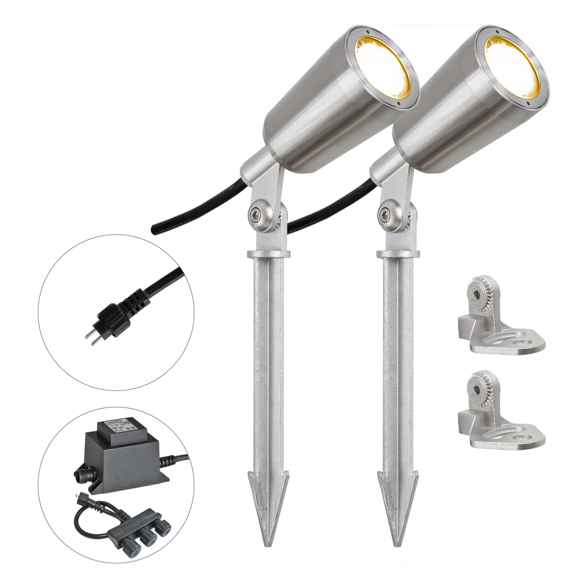 Die massiven LED-Strahler können für vielfältige Anwendungen zum Einsatz gebracht werden. Da im Lieferumfang für jeden Spot sowohl ein Stativ (Montagefuß), als auch ein Erdspieß enthalten sind, können die Spots nahezu überall montiert werden. Aufgrund der gegebenen Schutzart ist sogar der Einsatz unter Wasser bis zu einer Tauchtiefe von 1,5m möglich. Das komplette Set wird über das IP44-Stecksystem einfach verkabelt. An jedem Spot befindet sich eine 5m lange Anschlussleitung. Außerdem befindet sich im Set ein 3-fach-verteiler, sowie das Vorschaltgerät, welches eine 2m lange Zuleitung mit Konturenstecker hat. Sowohl der Erdspieß, als auch das Stativ sind mit einem feinen Zahnraster versehen, um ein ungewolltes schwenken des Spots zu verhindern. Der Schwenkwinkel beträgt 60°. Die technischen Daten beziehen sich auf einen Spot.