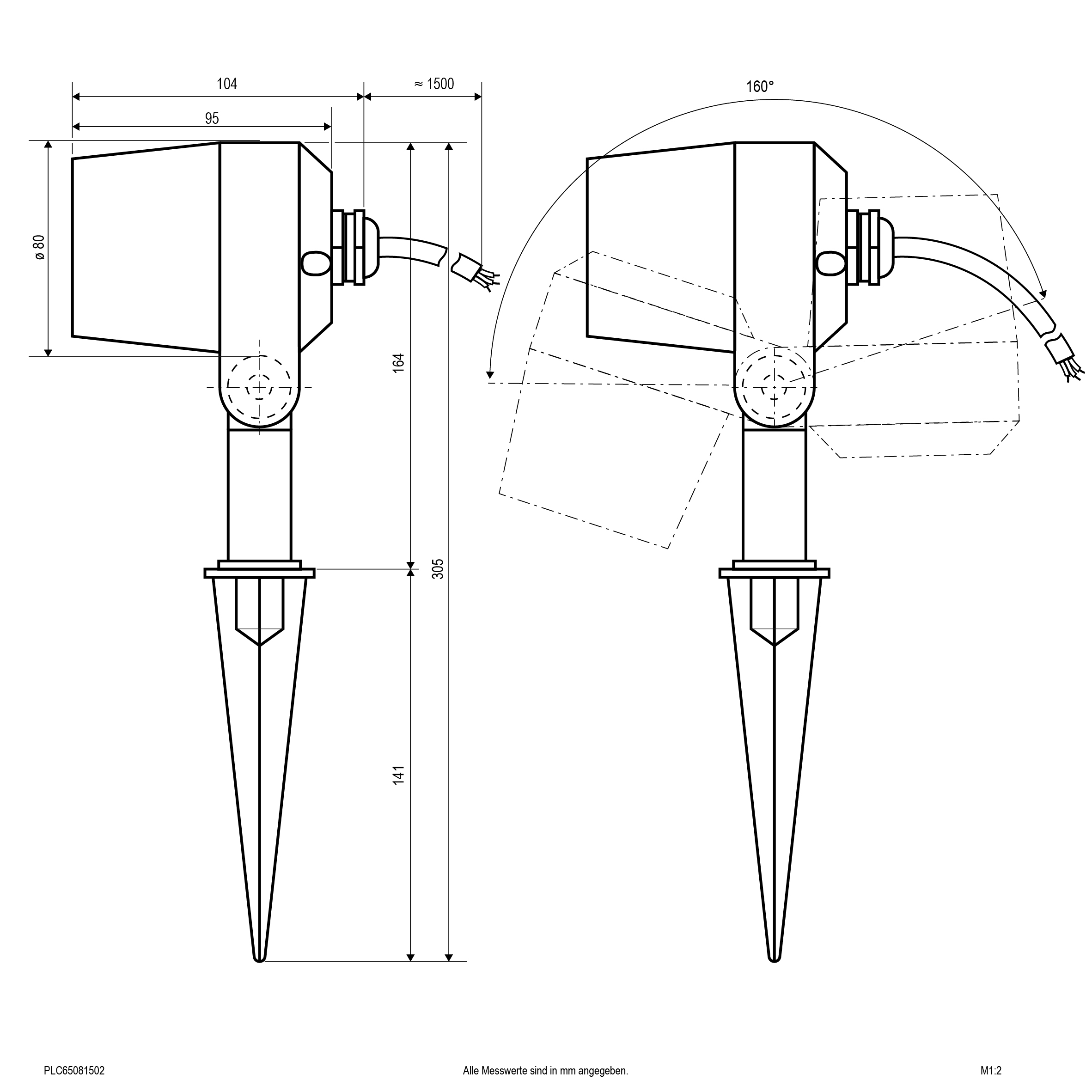 Die Leuchte kann entweder mit dem mitgeliefertem Erdspieß im weichen Untergrund montiert werden, oder optional mit dem separat erhältlichen Montagefuß (PLCM6508). Am Strahler befindet sich eine 1,5m lange Anschlussleitung mit freien Aderenden. Die Gehäusefarbe entspricht RAL7016.