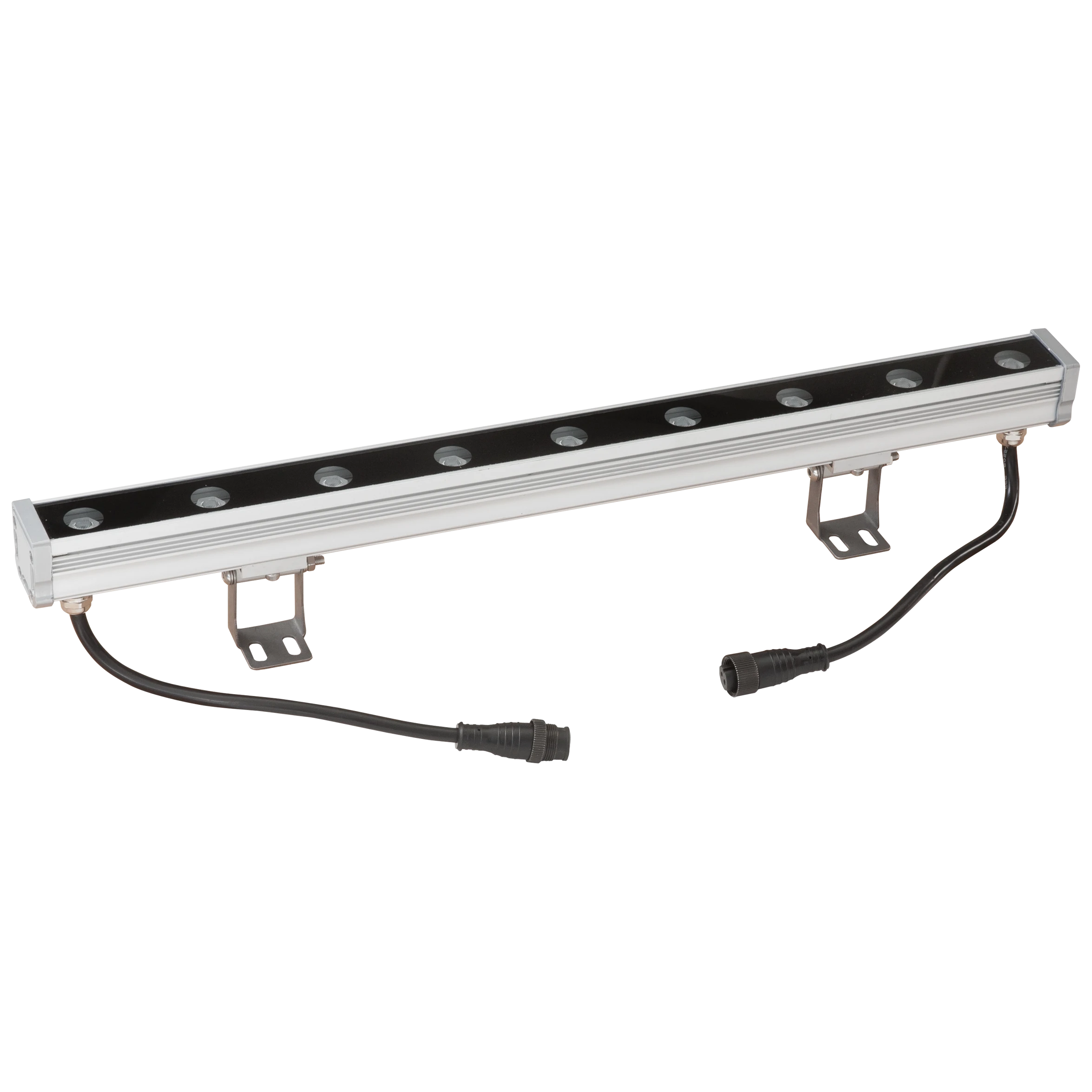 Der LED Wallwasher kann nicht nur für zahlreiche Anwendungen im Außenbereich, sondern ebenso im Innenbereich verwendet werden. Die Montage erfolgt mit den im Lieferumfang enthaltenen Haltern. Diese ermöglichen einen Schwenkbereich von 225°. Die angegebene Höhe ist inkl. Halter, im nicht geschwenkten Zustand gemessen. Zur Vermeidung von Kondenswasser verfügt der Wallwasher über ein selbstentlüftendes Entlüftungsventil. An beiden Seiten des Wallwasher befindet sich eine jeweils 20cm lange Anschlussleitung mit Stecker bzw. Buchse, wodurch mehrere Wallwascher (max. 12) miteinander verbunden und somit über nur ein Betriebsgerät betrieben werden können. Die Zuleitung zum Anschluss an das Netzgerät ist separat, in den Längen 10m (P65ASL1000UNI) oder 3m (P65ASL300UNI) erhältlich. Ebenso ist eine 1m lange Verbindungsleitung separat erhältlich (P65VBL100UNI). ta: -20°C - 45°C. Der Ausstrahlwinkel beträgt 40°.