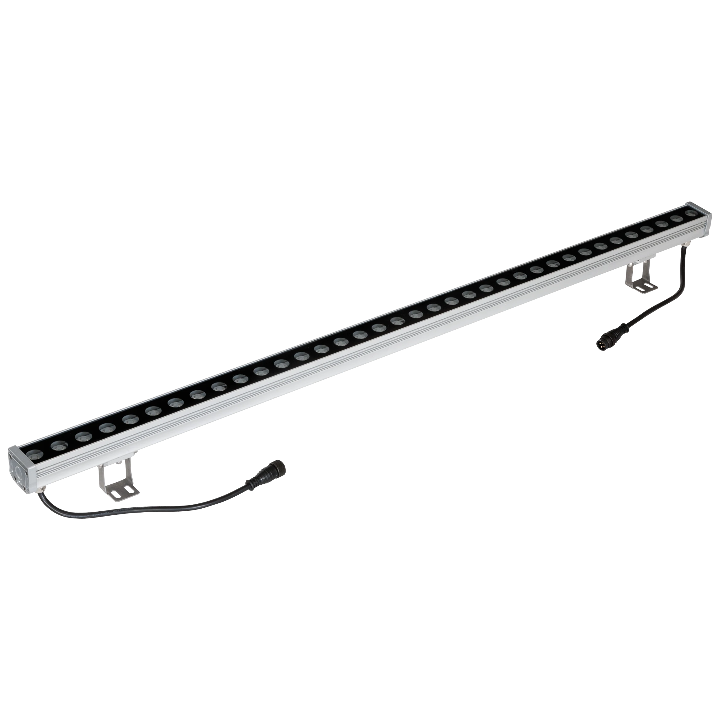 Der RGB LED Wallwasher kann nicht nur für zahlreiche Anwendungen im Außenbereich, sondern ebenso im Innenbereich verwendet werden. Die Montage erfolgt mit den im Lieferumfang enthaltenen Haltern. Diese ermöglichen einen Schwenkbereich von 225°. Die angegebene Höhe ist inkl. Halter, im nicht geschwenkten Zustand gemessen. Zur Vermeidung von Kondenswasser verfügt der Wallwasher über ein selbstentlüftendes Entlüftungsventil. An beiden Seiten des Wallwasher befindet sich eine jeweils 24cm lange Anschlussleitung mit Stecker bzw. Buchse, wodurch mehrere Wallwascher (max. 4) miteinander verbunden und somit über nur ein Betriebsgerät und einen Controller betrieben werden können. Dadurch können alle Wallpainer synchron gesteuert werden. Die Zuleitung zum Anschluss an das Netzgerät ist separat, in den Längen 10m (P65ASL1000RGB) oder 3m (P65ASL300RGB) erhältlich. Ebenso ist eine 1m lange Verbindungsleitung separat erhältlich (P65VBL100RGB). Die angegebenen Lumen werden bei voller Leistung aller Farben erreicht. ta: -20°C - 45°C. Der Ausstrahlwinkel beträgt 40°.