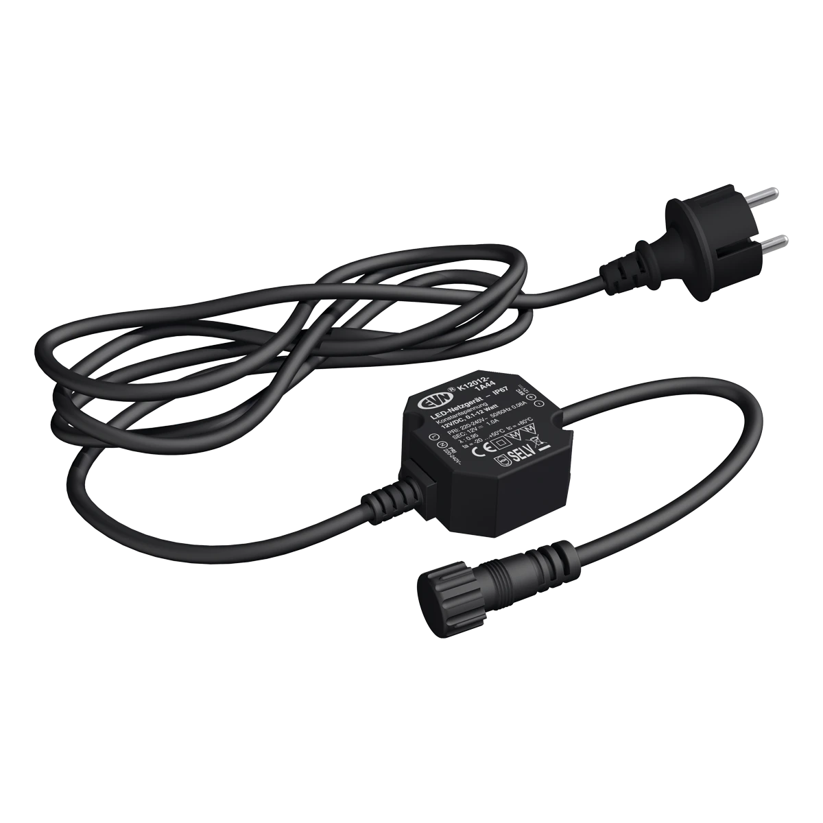 Der kurzschlussfeste Sicherheitstransformator kann auf Grund der höheren Schutzart problemlos im Außenbereich verwendet werden, lässt sich aber z. B. auch beim Möbelbau verwenden, da die MM-Kennzeichnung gegeben ist. Das Netzgerät verfügt primärseitig über eine 1,8m lange Gummileitung mit Konturenstecker und sekundärseitig über eine 20cm lange Gummileitung mit Buchse für das IP44-Stecksystem. Technische Daten: Versorgungsspannung: 220-240V/AC und 180-250V/DC, ta: -20°C - 50°C, tc: 80°C, Powerfaktor: 0,95.