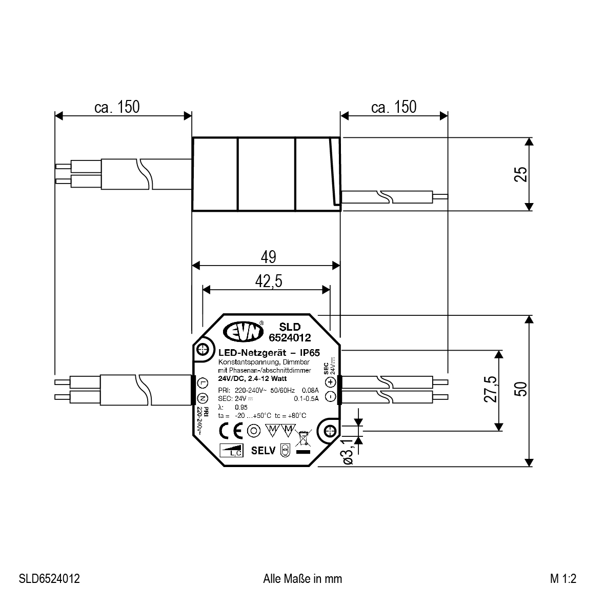 Der kurzschlussfeste Sicherheitstransformator lässt sich auf Grund der höheren Schutzart problemlos im Außenbereich einsetzen, kann aber z. B. auch beim Möbelbau verwendet werden, da die MM-Kennzeichnung gegeben ist. Bei Verwendung eines LED-Dimmers mit einer Mindestlast von max. 3W beträgt der Dimmbereich 100 - 0%, bei Verwendung eines LED-Dimmers mit höherer Mindestlast besteht ggf. ein verringerter Dimmbereich. Die Anschlussleitungen haben eine Länge von 15cm primärseitig und 15cm sekundärseitig. Technische Daten: Versorgungsspannung: 220-240V/AC und 180-250V/DC, ta: -20°C - 50°C, tc: 80°C, Powerfaktor 0,95.