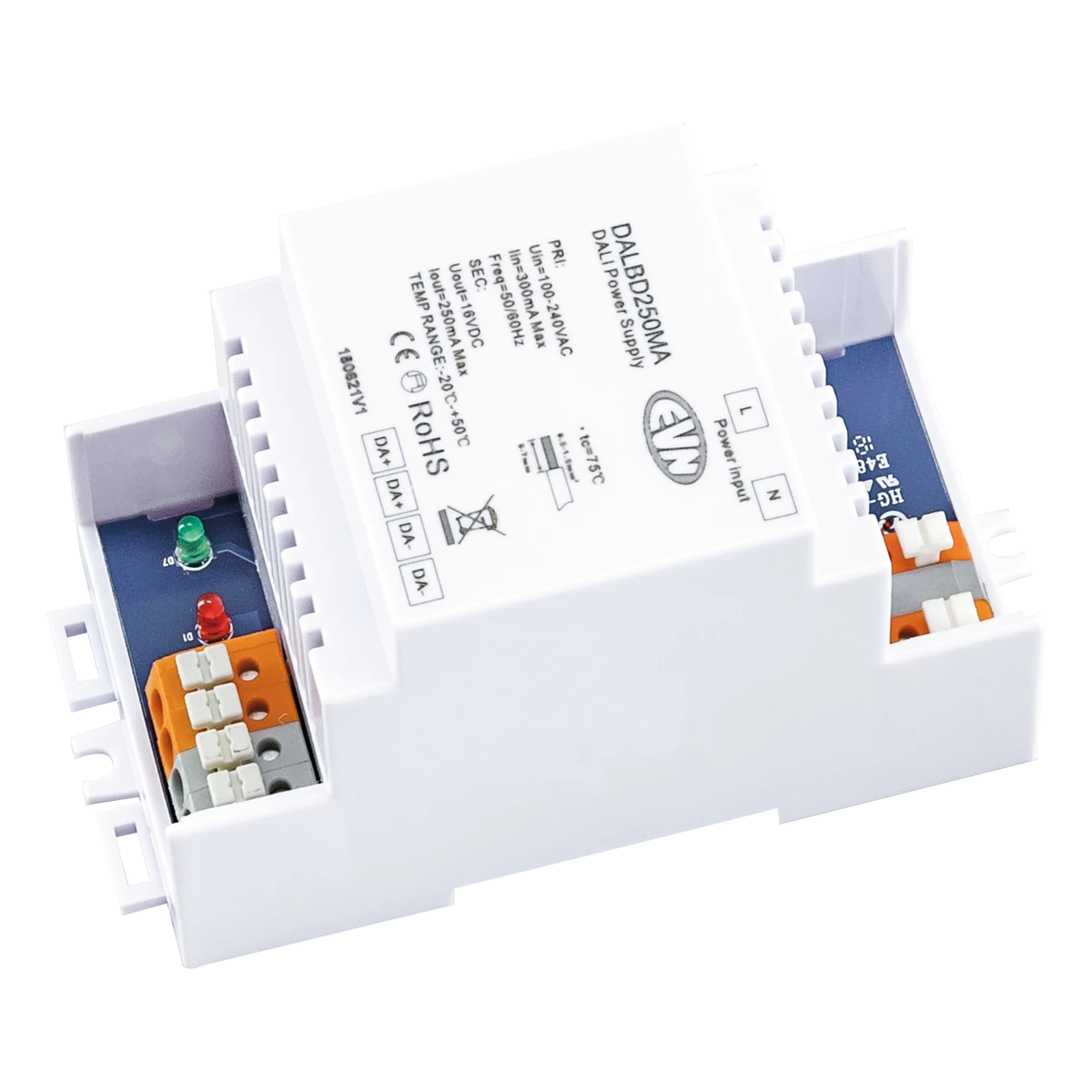 Die DALI-Basisstation verfügt über 2 BUS-Ausgänge und einen max. Ausgangsstrom von 250mA, wodurch auch größere Leitungswege ohne Probleme realisiert werden können. Natürlich ist die Basisstation kompatibel zu allen gängigen DALI-Komponenten. Die Klemmen, sowohl Primär- als auch sekundärseitig, sind für Kabel von 0,5mm² - 1,5mm² geeignet. Technische Daten: ta: -20°C - 50°C, tc: 75°C. Konform Standardprotokoll IEC 60929.