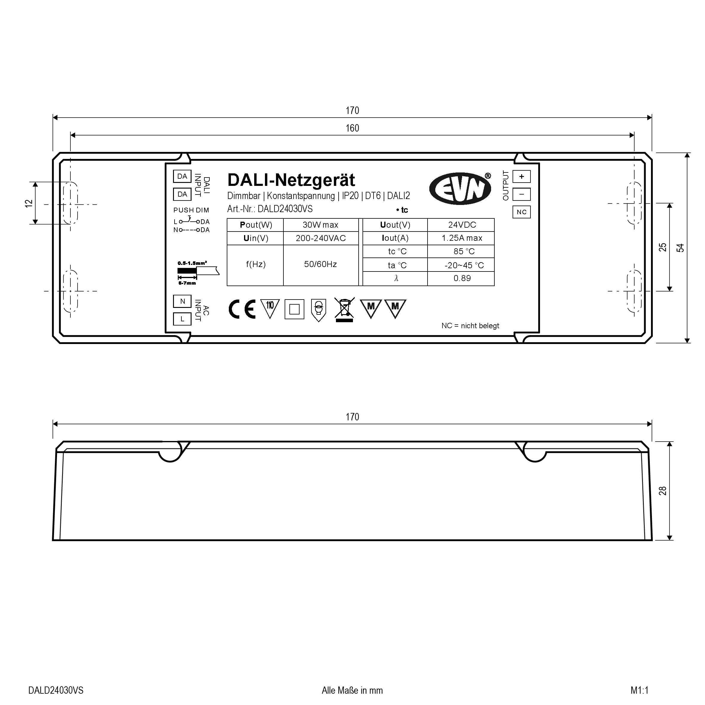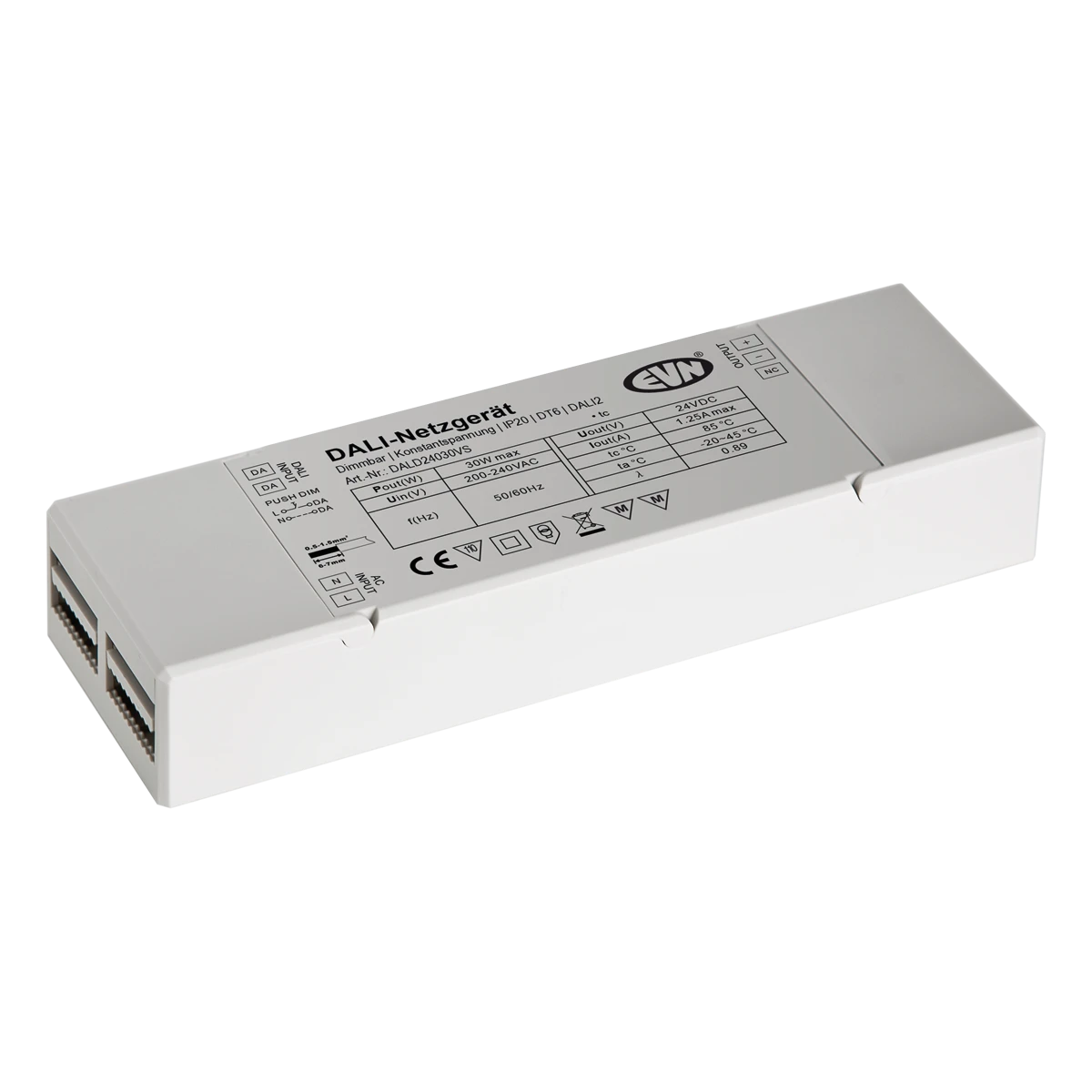 DALI-Dimmer-Empfänger mit integriertem Netzgerät für Unicolor-Leuchten mit automatischer DALI Adressen Einstellung. Ein Zusätzliches Betriebsgerät ist nicht erforderlich, da der Empfänger gleichzeitig als solches fungiert. Optional ist der Empfänger auch über Push-L dimmbar. Anschlüsse: 1x Eingang für DALI-Bus oder Push-L, 1x Eingang für 200-240V/AC und 1x Ausgang für 24V/DC. Die Steckklemmen sind für Kabel von 0,5mm² - 1,5mm² geeignet. Technische Daten: ta: -20°C - 45°C, tc: 85°C, Leistung: 0,1-30W, Powerfaktor: 0,90. Konform Standardprotokoll IEC 60929. Protokoll: DT6, DALI2.