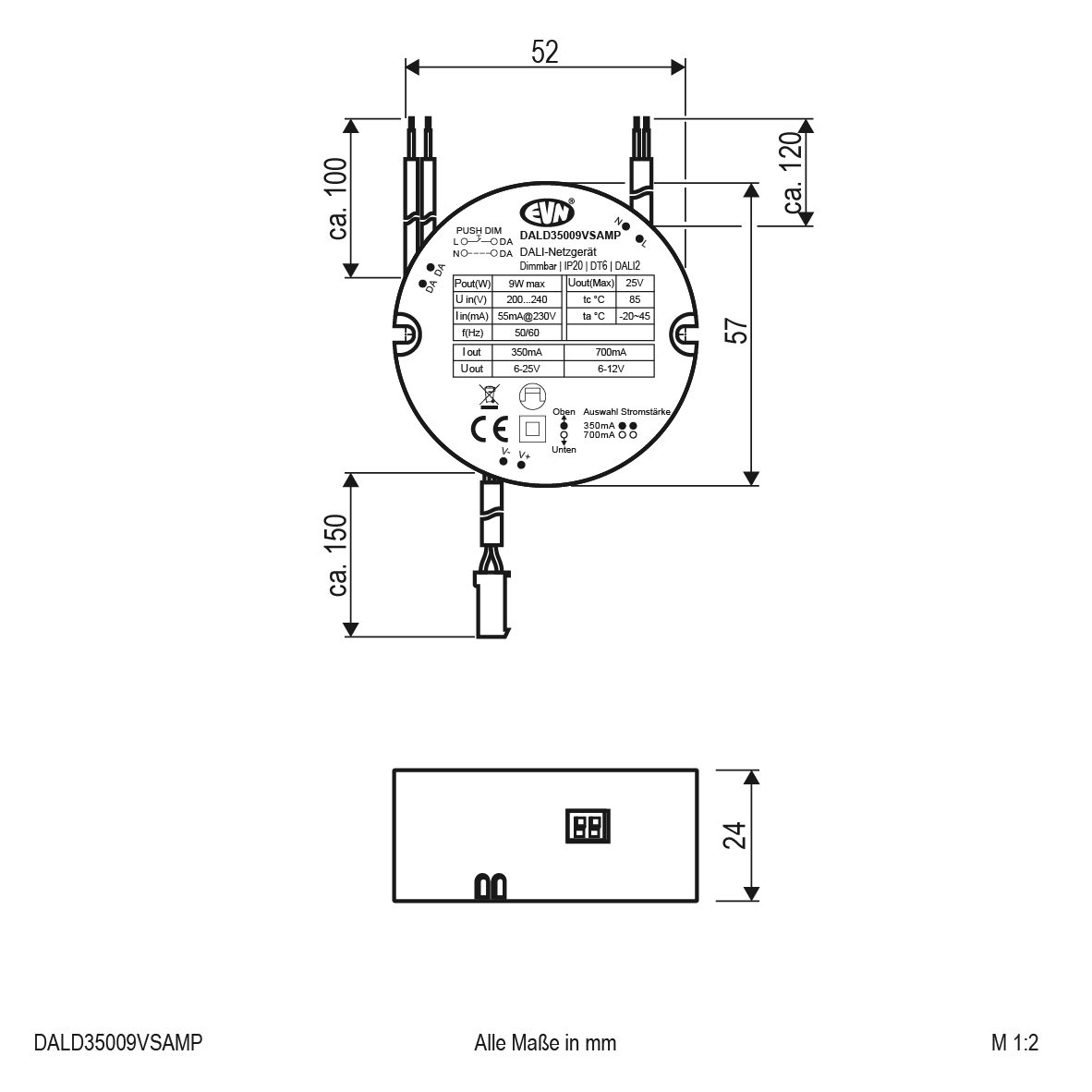 DALI-Dimmer-Empfänger mit integriertem Netzgerät für Unicolor-Leuchten mit automatischer DALI Adressen Einstellung. Ein zusätzliches Betriebsgerät ist nicht erforderlich, da der Empfänger gleichzeitig als solches fungiert. Optional ist der Empfänger auch über Push-L (als 1-Kanal) dimmbar. Mittels Dipschalter kann der Ausgangsstrom auf 350mA oder 700mA eingestellt werden. Anschlüsse: 1x Eingang für DALI-Bus oder Push-L, 1x Eingang für 200-240V/AC und 1x Ausgang mit AMP-Buchse für 350mA bzw. 700mA. Die Anschlusskabel haben jeweils eine Länge von 20cm. Technische Daten: ta: -20°C - 45°C, tc: 85°C, Leistung: 2,1-9W, Powerfaktor: 0,95. Protokoll: DT6, DALI2.