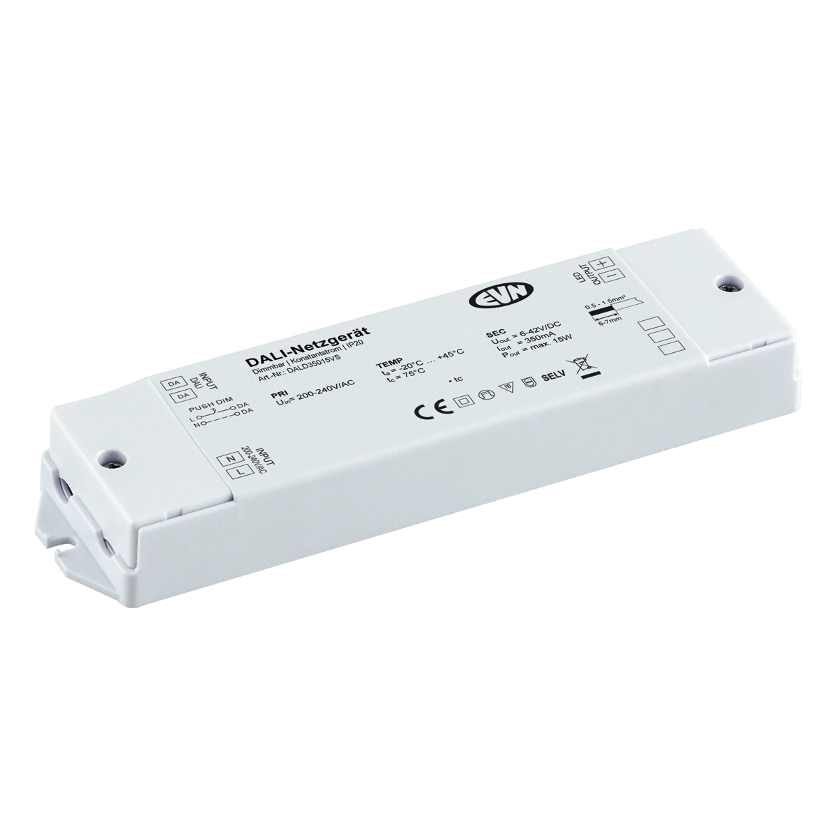 DALI-Dimmer-Empfänger mit integriertem Netzgerät für Unicolor-Leuchten mit automatischer DALI Adressen Einstellung. Ein Zusätzliches Betriebsgerät ist nicht erforderlich, da der Empfänger gleichzeitig als solches fungiert. Optional ist der Empfänger auch über Push-L (als 1-Kanal) dimmbar. Anschlüsse: 1x Eingang für DALI-Bus oder Push-L, 1x Eingang für 200-240V/AC und 1x Ausgang für 350mA. Die Schraubklemmen sind für Kabel von 0,5mm² - 1,5mm² geeignet. Technische Daten: ta: -20°C - 45°C, tc: 75°C, Leistung: 2,1-15W, Powerfaktor: 0,95.