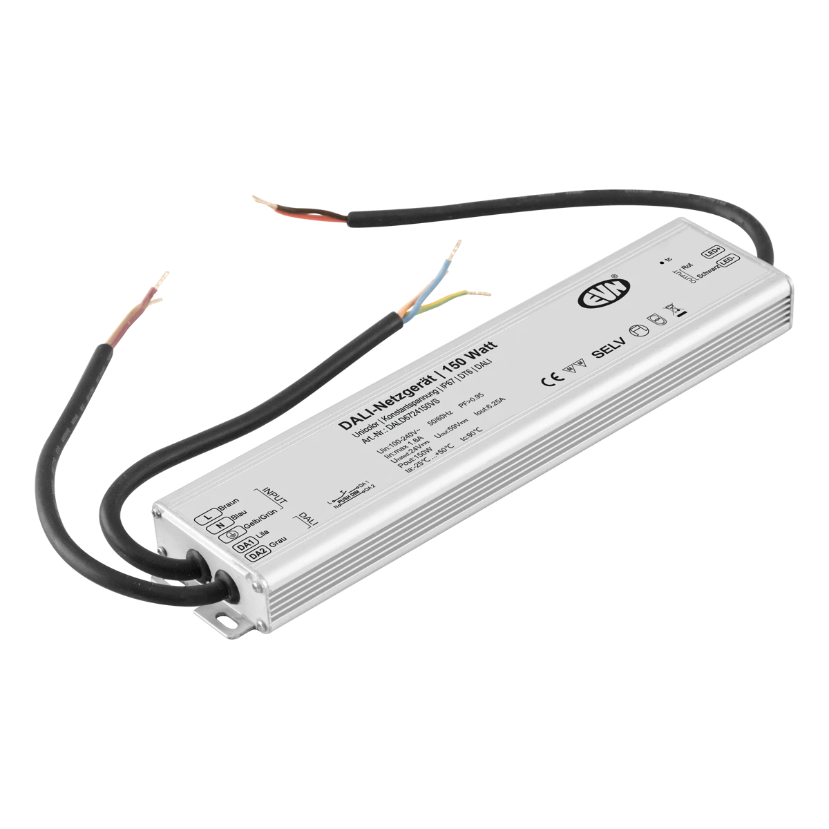 DALI-Dimmer-Empfänger mit integriertem Netzgerät für Unicolor-Leuchten mit manueller oder automatischer DALI Adressen Einstellung. Ein Zusätzliches Betriebsgerät ist nicht erforderlich, da der Empfänger gleichzeitig als solches fungiert. Optional ist der Empfänger auch über Push-L dimmbar. Anschlüsse: 1x Eingang für DALI-Bus oder Push-L, 1x Eingang für 100-240V/AC und 1x Ausgang für 24V/DC. Die Anschlussleitungen haben jeweils eine Länge von 24cm. Technische Daten: ta: -25°C - 50°C, tc: 90°C, Leistung: 0,1-150W, Powerfaktor: 0,95. Konform Standardprotokoll IEC 60929. Protokoll: DT6, DALI2.
