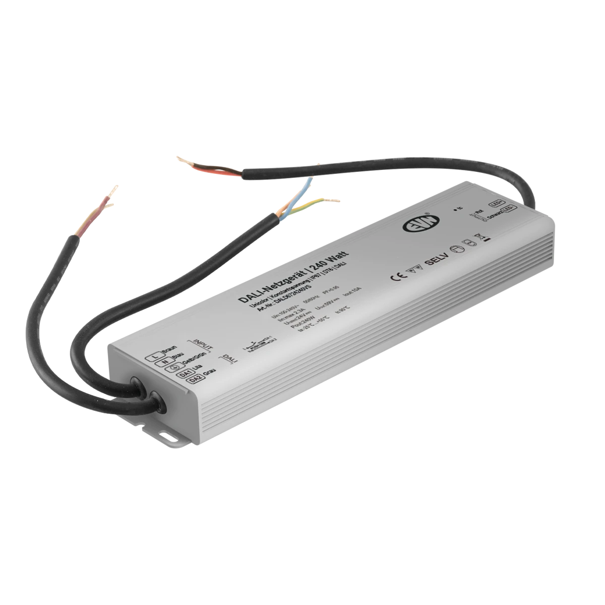 DALI-Dimmer-Empfänger mit integriertem Netzgerät für Unicolor-Leuchten mit manueller oder automatischer DALI Adressen Einstellung. Ein Zusätzliches Betriebsgerät ist nicht erforderlich, da der Empfänger gleichzeitig als solches fungiert. Optional ist der Empfänger auch über Push-L dimmbar. Anschlüsse: 1x Eingang für DALI-Bus oder Push-L, 1x Eingang für 100-240V/AC und 1x Ausgang für 24V/DC. Die Anschlussleitungen haben jeweils eine Länge von 24cm. Technische Daten: ta: -25°C - 50°C, tc: 90°C, Leistung: 0,1-240W, Powerfaktor: 0,95. Konform Standardprotokoll IEC 60929. Protokoll: DT6, DALI2.