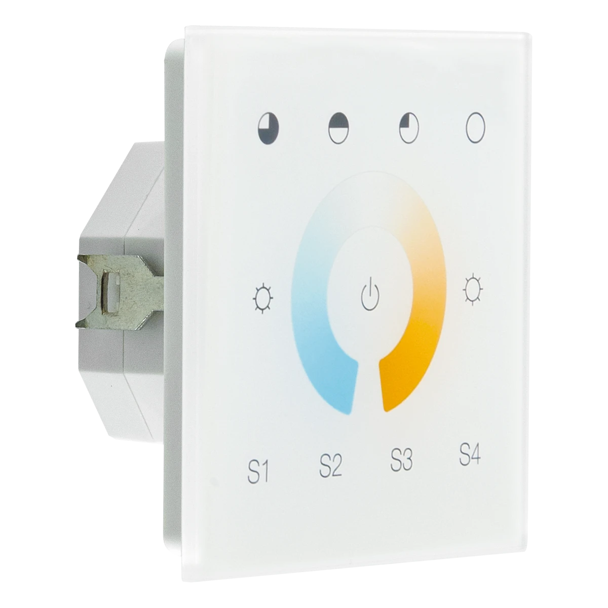 Mit dem DALI-Wandpanel können Verbraucher mit variabler Farbtemperatur gesteuert werden. Da es sich um ein Tunable-White-Wandpanel handelt, werden zwei DALI Adressen benötigt. Die Farbtemperatur wird über das Touch-Wheel eingestellt. Zusätzlich zu den vier voreingestellten Dimmstufen ist es auch möglich bis zu vier Lichtszenen zu speichern. Da das Wandpanel als BUS-Geber fungiert ist der Einsatz der DALI Basisstation optional möglich, jedoch nicht zwingend nötig. Bei Betrieb als BUS-Geber (ohne DALI Basisstation) erfolgt der Anschluss an 230V, wobei maximal 50 Teilnehmer über ein Wandpanel gesteuert werden können. Außerdem können 3 weitere Wandpanel in das System mit eingebunden werden, welche über die BUS-Spannung des ersten Wandpanel (BUS-Geber) betrieben werden. Bei Betrieb mit der DALI Basisstation können max. 4 Wandpanel je Basisstation eingesetzt werden. Hierbei dürfen die Wandpanel nicht über 230V, sondern ausschließlich über die BUS-Spannung der DALI Basisstation betrieben werden. Darüber Hinaus besteht die Möglichkeit zwei Wandpanel über 230V in einem System zu betreiben, wobei nur eines der Wandpanel als BUS-Geber fungiert. Hierdurch können bis zu 100 Teilnehmer (50 je Panel) angesteuert werden. In dieses System können zwei zusätzliche Wandpanel über die BUS-Spannung mit eingebunden werden, wobei die steuerbare Teilnehmeranzahl unverändert bleibt. Die Montage ist ohne Probleme auf Schalterdosen möglich. Bitte beachten: Das Panel sendet einen Broadcast-Befehl, welcher alle Komponenten innerhalb eines BUS-Systems auf lineares Dimmen umstellt. Diese Funktion kann nicht abgeschaltet werden.