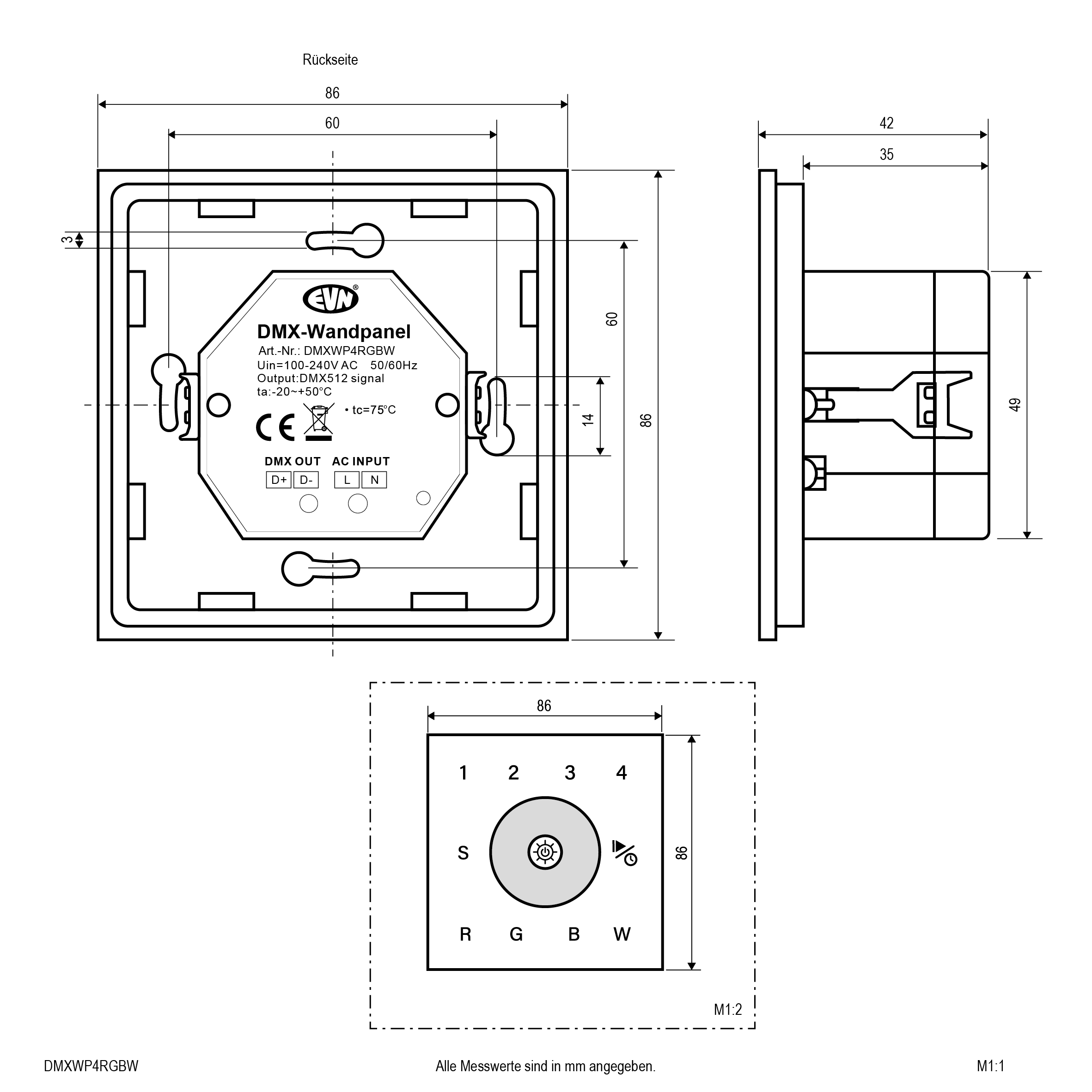 DMX-Wandpanel für die Ansteuerung der DMX-Controller. Steuerung von bis zu 4 separaten Zonen (Controllern). Für Schalterdosenmontage geeignet. Funktionen: Farbwechsel über Touch-Farbrad, Direktfarbwahl (rot, grün, blau und weiß), Ein- und ausschalten, so wie Programmwechsel. Technische Daten: ta: -20 - 50°C, tc: 75°C.