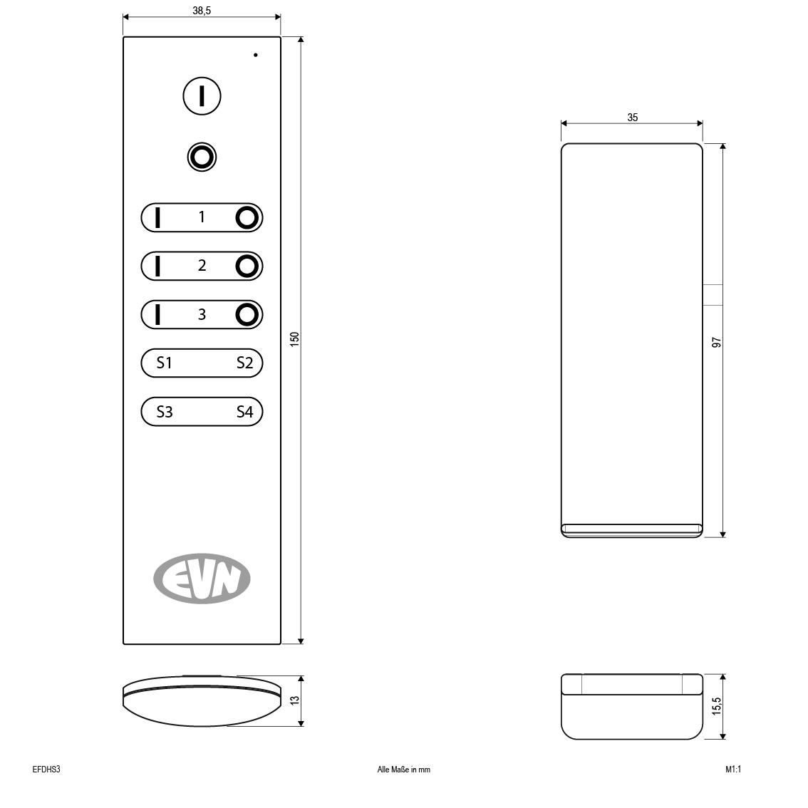 Die 3-Kanal Fernbedienung kann bis zu 3 Funk-Dimmer-Empfänger getrennt voneinander steuern. Dabei sind folgende Funktionen möglich: Ein, Aus, dimmen. Es können natürlich auch mehrere Empfänger auf einen Kanal eingelernt werden. Ebenso kann ein Empfänger auf mehrere Kanäle oder Handsender eingelernt werden. Die Lieferung erfolgt inkl. Wandhalterung. Passend für folgende Funk-Dimmer-Empfänger: EFDP23400 und EFD12244X5A. Betrieb über 1x CR2025 3V Batterie (nicht im Lieferumfang enthalten).