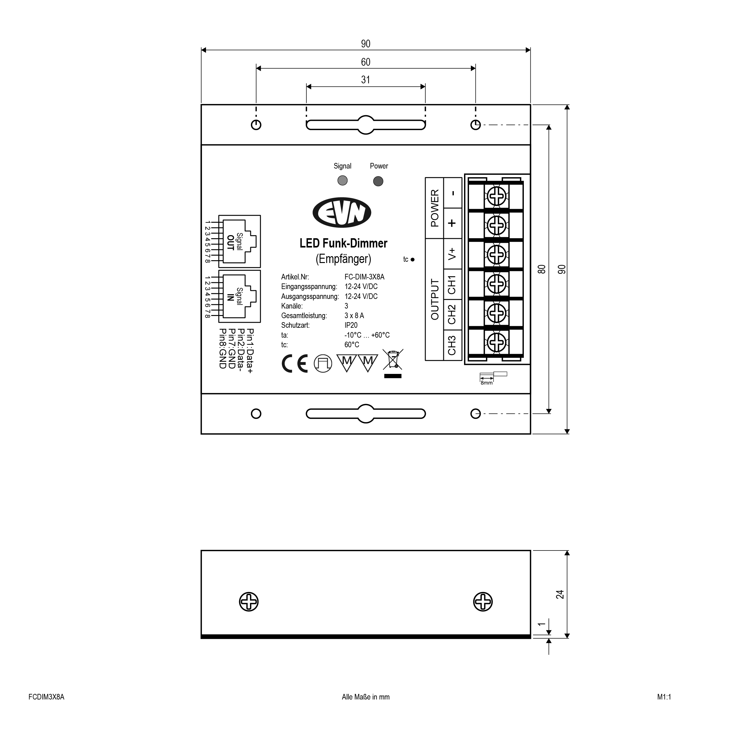 Funk-Dimmer-Empfänger für Unicolor-LED-Leuchten. Geeignet für Leuchten mit einer Betriebsspannung von 12 und 24V/DC. Die tatsächlich zu verwendende Eingangsspannung ist abhängig von der benötigten Spannung der zu dimmenden Leuchten. 1x Eingang für 12-24V/DC, 3x Ausgang für 12-24V/DC, sowie 2x RJ45-Anschluss für Master-Slave-Anwendungen. Somit bietet der Controller zwei Möglichkeiten für größere Anlagen: Entweder wird das Steuersignal sekundärseitig mittels Repeater erweitert, oder es werden mehrere Controller über die RJ45-Anschlusse als Master-Slave verbunden. Die Ausgänge werden alle synchron gedimmt. Die Schraubklemmen sind für Kabel bis max. 2,5mm² geeignet. Technische Daten: ta: -10°C - 60°C, tc: 60°C, max. Ausgangsleistung je Kanal: 8A, 96W bei 12V/DC und 192W bei 24V/DC. Kompatible Funk-Dimmer-Sender: WP-DIM-WW-CW-w, HS-DIM-WW-CW.
