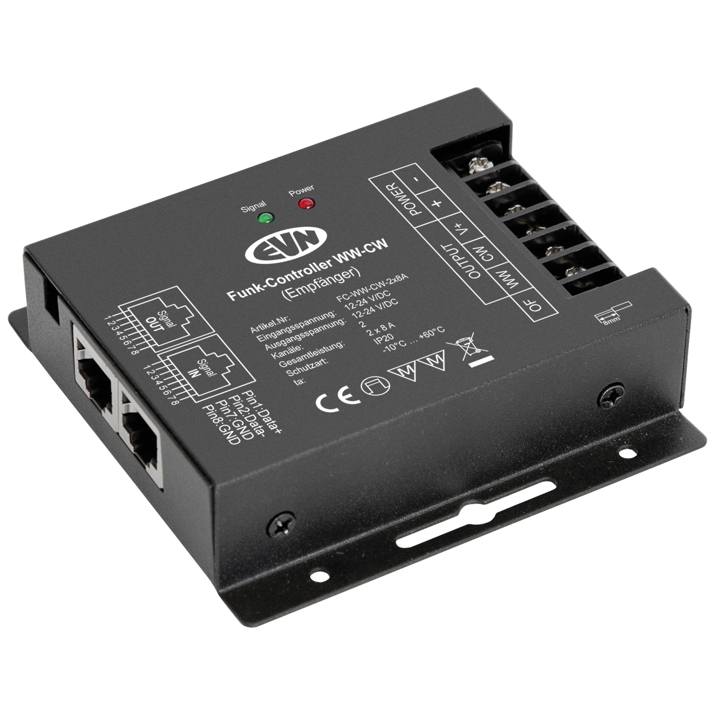 Funk-Controller-Empfänger für warmweiß-kaltweiß-LED-Leuchten. Geeignet für Leuchten mit einer Betriebsspannung von 12 und 24V/DC. Die tatsächlich zu verwendende Eingangsspannung ist abhängig von der benötigten Spannung der zu steuernden Leuchten. 1x Eingang für 12-24V/DC, 1x Ausgang für bicolor-LED-Leuchten, sowie 2x RJ45-Anschluss für Master-Slave-Anwendungen. Somit bietet der Controller zwei Möglichkeiten für größere Anlagen: Entweder wird das Steuersignal sekundärseitig mittels Repeater erweitert, oder es werden mehrere Controller über die RJ45-Anschlusse als Master-Slave verbunden. Die Schraubklemmen sind für Kabel bis max. 2,5mm² geeignet. Technische Daten: ta: -10°C - 60°C, tc: 60°C, max. Ausgangsleistung je Kanal: 8A, 96W bei 12V/DC und 192W bei 24V/DC. Kompatible Funk-Controller: WP-RGBW-w, HS-RGBW.