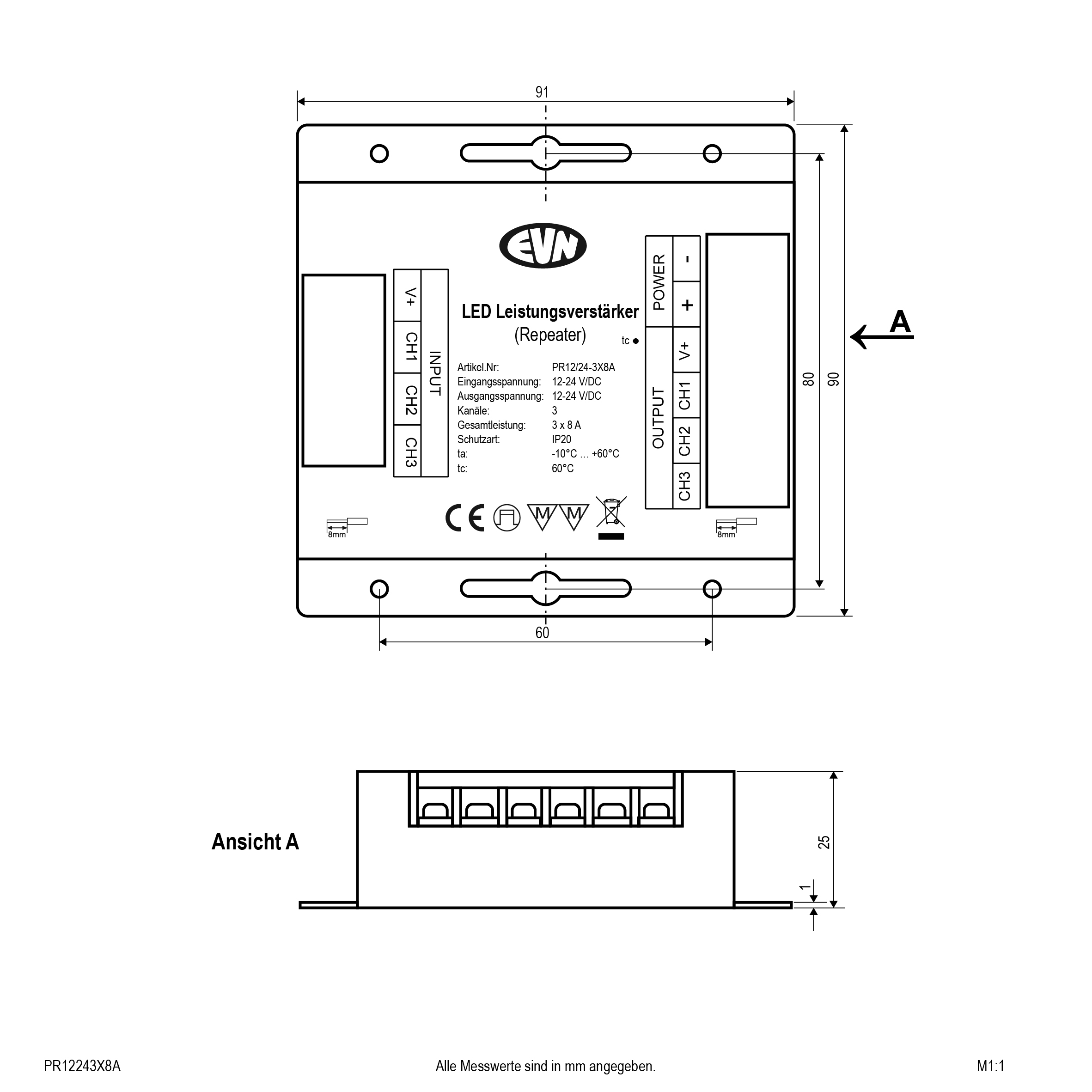 Power-Repeater für Unicolor- und RGB-LED-Leuchten. Der Repeater kann an nahezu allen LED-Dimmer, weiß- und RGB-Steuerungen angeschlossen werden, um die jeweiligen Signale zu erweitern und dadurch auch größere Beleuchtungsszenarien mit nur einer Steuerung synchron betreiben zu können. Geeignet für Leuchten mit einer Betriebsspannung von 12 und 24V/DC. Die tatsächlich zu verwendende Eingangsspannung ist abhängig von der benötigten Spannung der angeschlossenen Leuchten. 1x Eingang für 12-24V/DC, 4x Eingang für die Steuerleitungen (+,Kanal 1, 2, 3) und 4x Ausgang (Kanal 1, 2, 3 und gemeinsamer Pluspol). Die Schraubklemmen sind für Kabel von 0,5mm² - 2,5mm² geeignet. Technische Daten: ta: -10°C - 60°C, tc: 60°C, max. Ausgangsleistung je Kanal: 8A (96W bei 12V/DC und 192W bei 24V/DC).