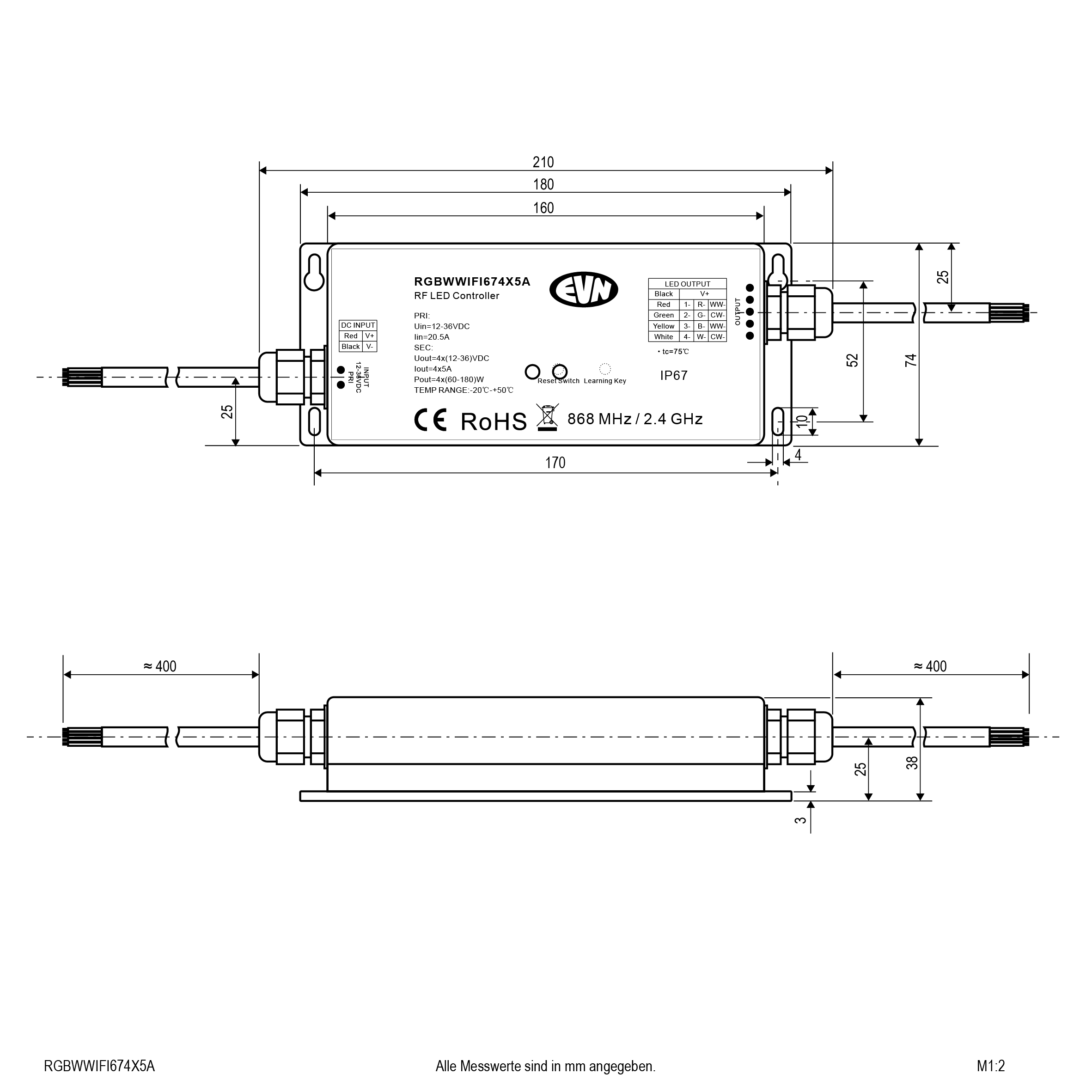 WIFI-RGB-Controller für RGB- und RGBW-LED-Leuchten. Einfache Steuerung der Leuchten über Smartphone oder Tablet, sowohl über Android, als auch über IOS-Geräte. Geeignet für Leuchten mit einer Betriebsspannung von 12, 24 und 36V/DC. Die tatsächlich zu verwendende Eingangsspannung ist abhängig von der benötigten Spannung der angeschlossenen Leuchten. 1x Eingang für 12-36V/DC und 5x Ausgang (RGBW+). Die Anschlussleitungen haben jeweils eine Länge von 40cm. Technische Daten: ta: -20°C - 50°C, tc: 75°C, max. Ausgangsleistung je Kanal: 5A (60W bei 12V/DC, 120W bei 24V/DC und 180W bei 36V/DC). Optional kann die Ansteuerung auch über Funk-Sender mit 868MHz oder 2,4GHz erfolgen.