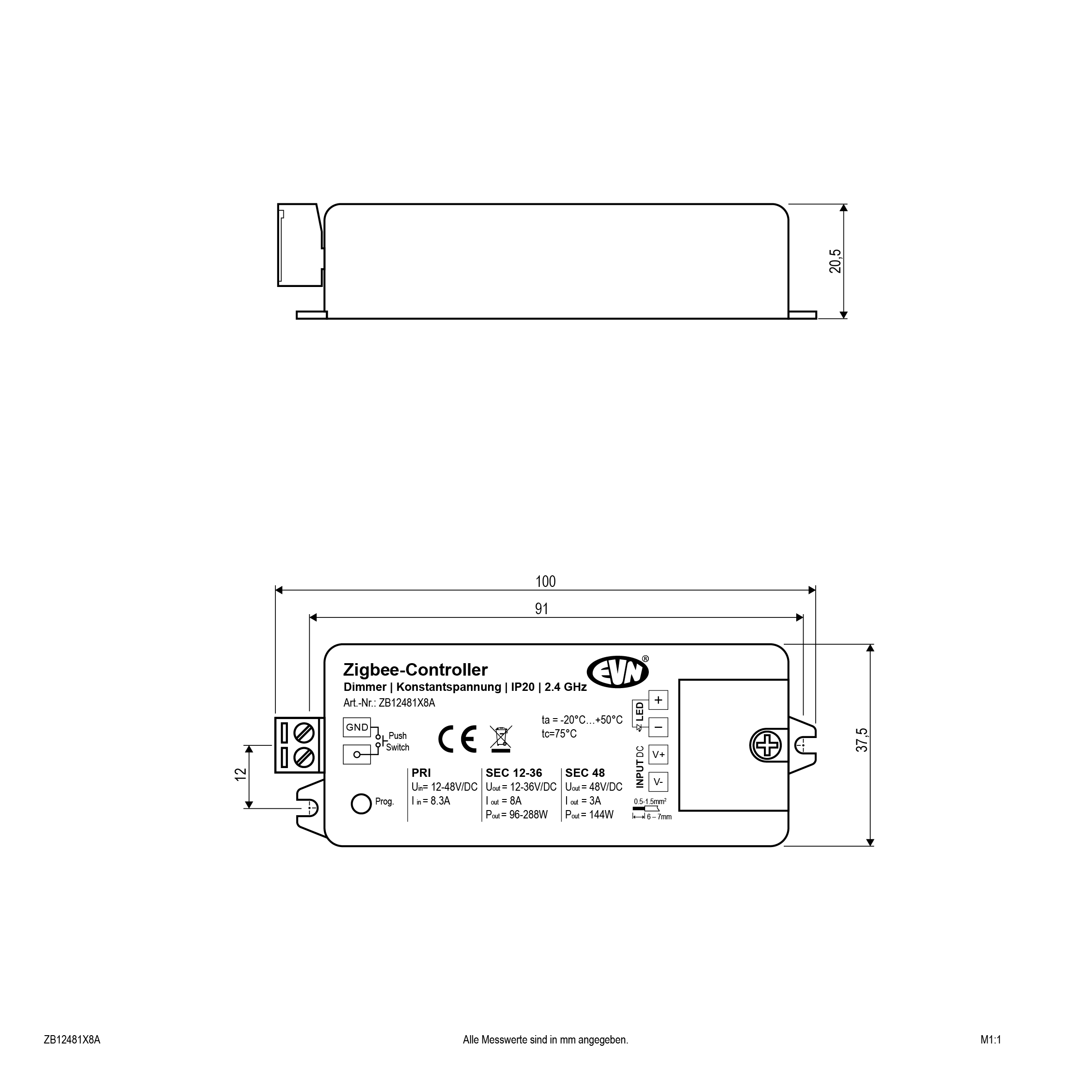 LED Zigbee 3.0 Empfänger zur Dimmung von Unicolor-Leuchten. Geeignet für Leuchten mit einer Betriebsspannung von 12, 24, 36 und 48V/DC. Die tatsächlich zu verwendende Eingangsspannung ist abhängig von der benötigten Spannung der angeschlossenen Leuchten. 1x Eingang, so wie 1x Ausgang für 12-48V/DC. Die Schraubklemmen sind für Kabel von 0,5mm² - 1,5mm² geeignet. Technische Daten: ta: -20°C - 50°C, tc: 75°C, max. Ausgangsleistung: 8A bei 12-36V/DC (96W bei 12V/DC, 192W bei 24V/DC, 288W bei 36V/DC) und 3A bei 48V/DC (144W) . Die Ansteuerung erfolgt über Funk-Sender mit 2,4GHz. Optional kann der Empfänger auch über einen potentialfreien Kontakt gedimmt werden.