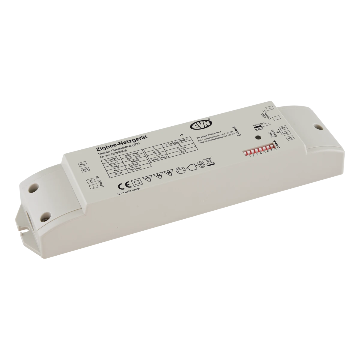 Zigbee 3.0 Dimmer-Empfänger mit integriertem Netzgerät für Unicolor-Leuchten. Ein Zusätzliches Betriebsgerät ist nicht erforderlich, da der Empfänger gleichzeitig als solches fungiert. Optional ist der Empfänger auch über Push-L (als 1-Kanal) dimmbar. Anschlüsse: 1x Eingang potentialfreien Kontakt, 1x Eingang für 200-240V/AC und 1x Ausgang für 350mA. Die Schraubklemmen sind für Kabel von 0,5mm² - 1,5mm² geeignet. Technische Daten: ta: -20°C - 45°C, tc: 75°C, Leistung: 10,5-50W, Powerfaktor: 0,95.
