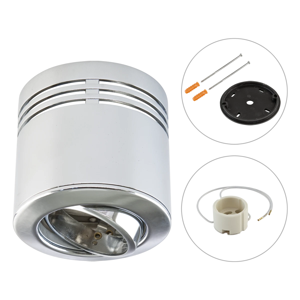 Schwenkbare Deckenanbauleuchte für vielfältige Anwendungen im Innenbereich. Sowohl Effektbeleuchtungen, Raumbeleuchtung, Akzentuierte Beleuchtung und vieles mehr, lassen sich mit dieser Leuchte umsetzten. Durch die Hochvoltfassung lassen sich verschiedene Leuchtmittel für die Unterschiedlichsten Beleuchtungsanforderungen in die Leuchte einsetzen, ganz egal ob Halogen oder LED, wodurch der Gestaltungsmöglichkeit nahezu keine Grenzen gesetzt sind. Da die Leuchte direkt an die 230V-Zuleitung angeschlossen werden kann, entfallen zusätzliche Kosten für Betriebsgeräte. Technische Daten: Schwenkwinkel: 30°, Drehbereich: 355°, Material: Messing.